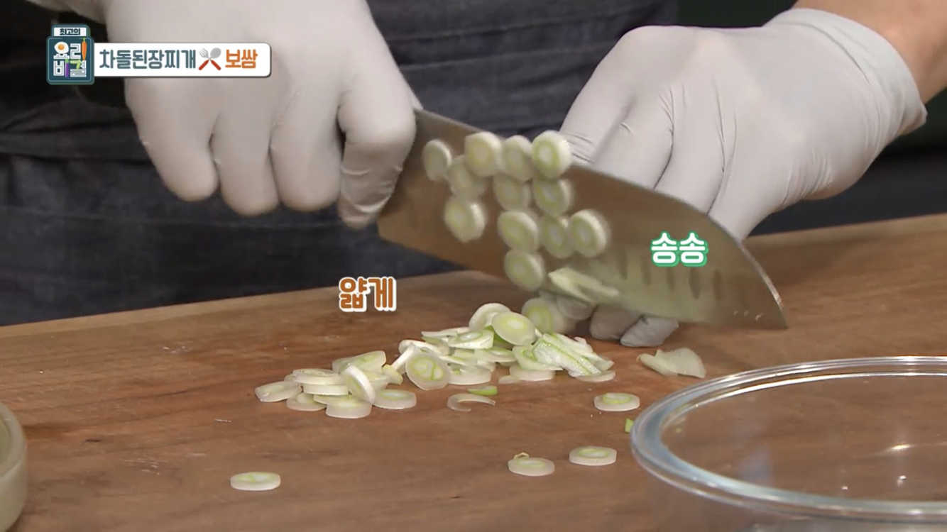 무는 얇게 나박 썰어주시고 파는 얇게 송송 썰어줍니다