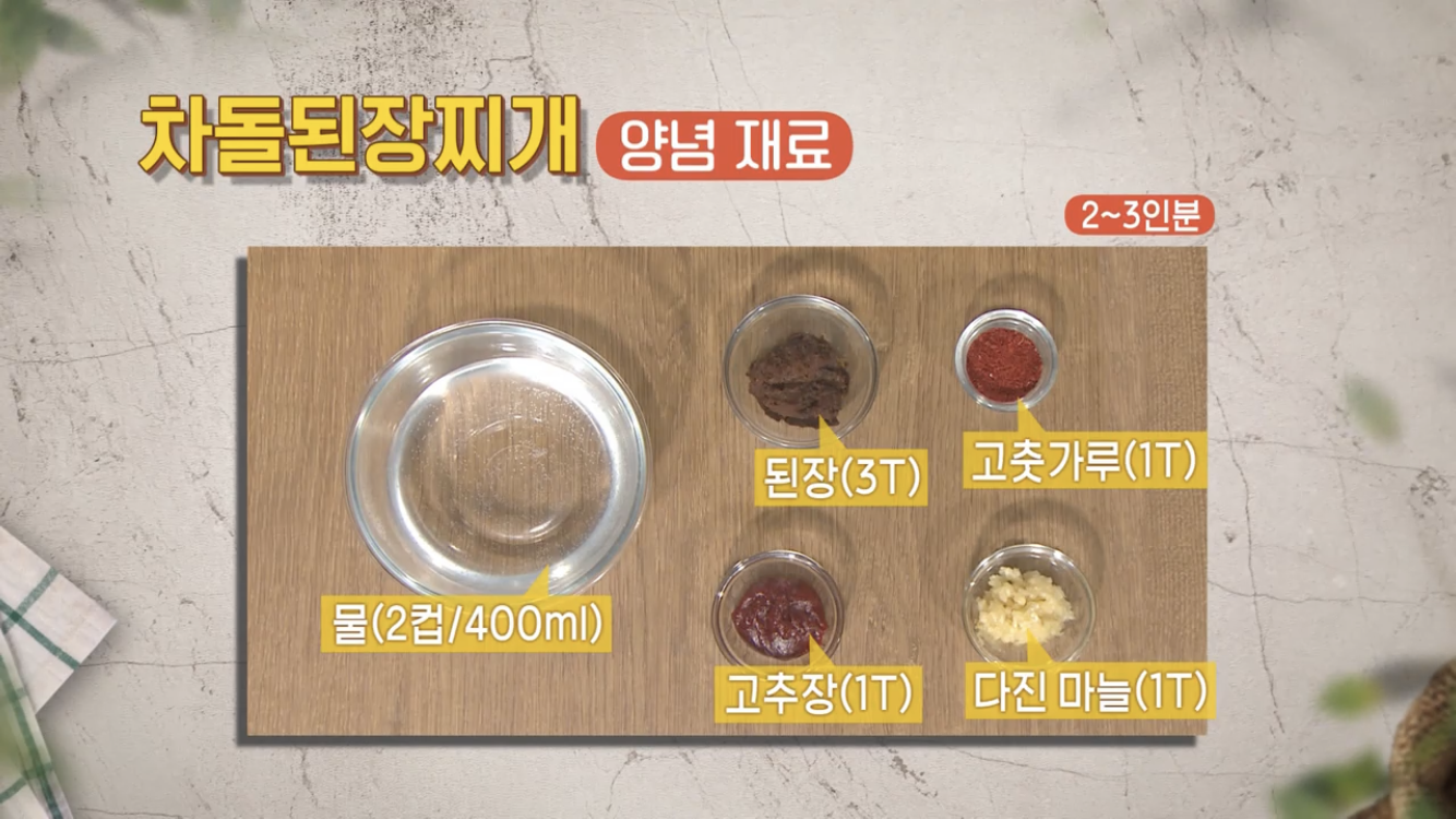 차돌된장찌개의 양념 재료는 물 2컵(400ml), 된장 3큰술, 고추장 1큰술, 고춧가루 1큰술, 다진 마늘 1큰술입니다