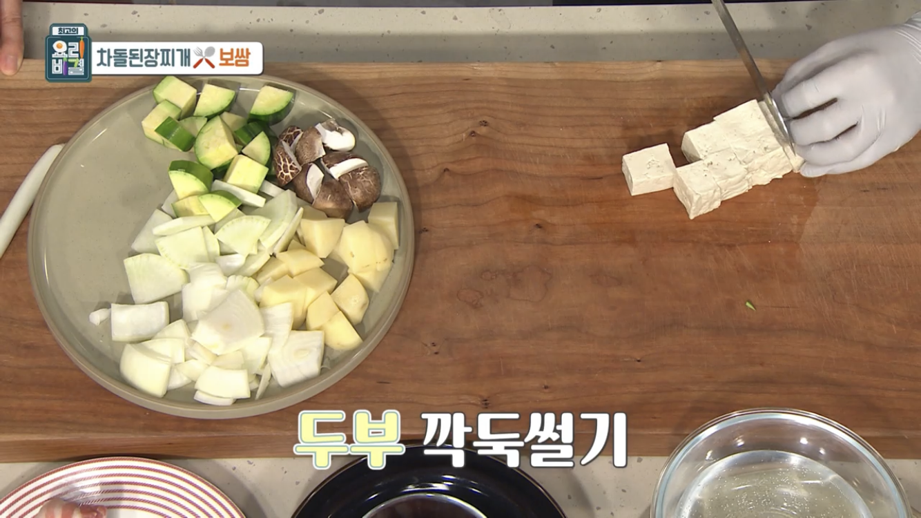 나머지 야채들 감자, 애호박, 표고버섯, 양파와 두부는 깍둑썰기로 썰어주시면 됩니다