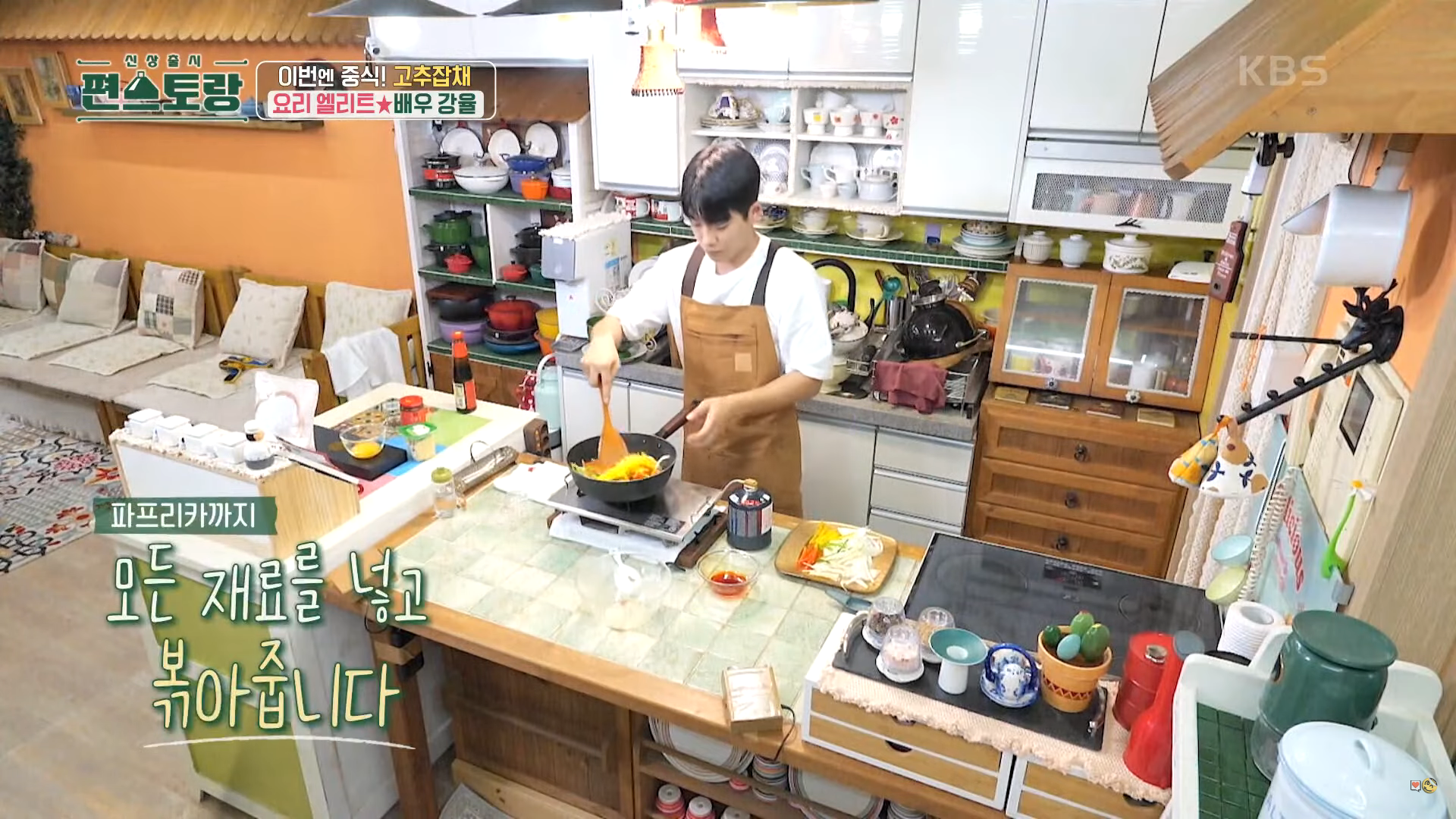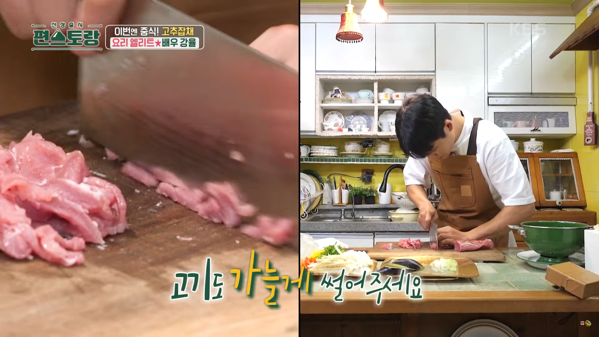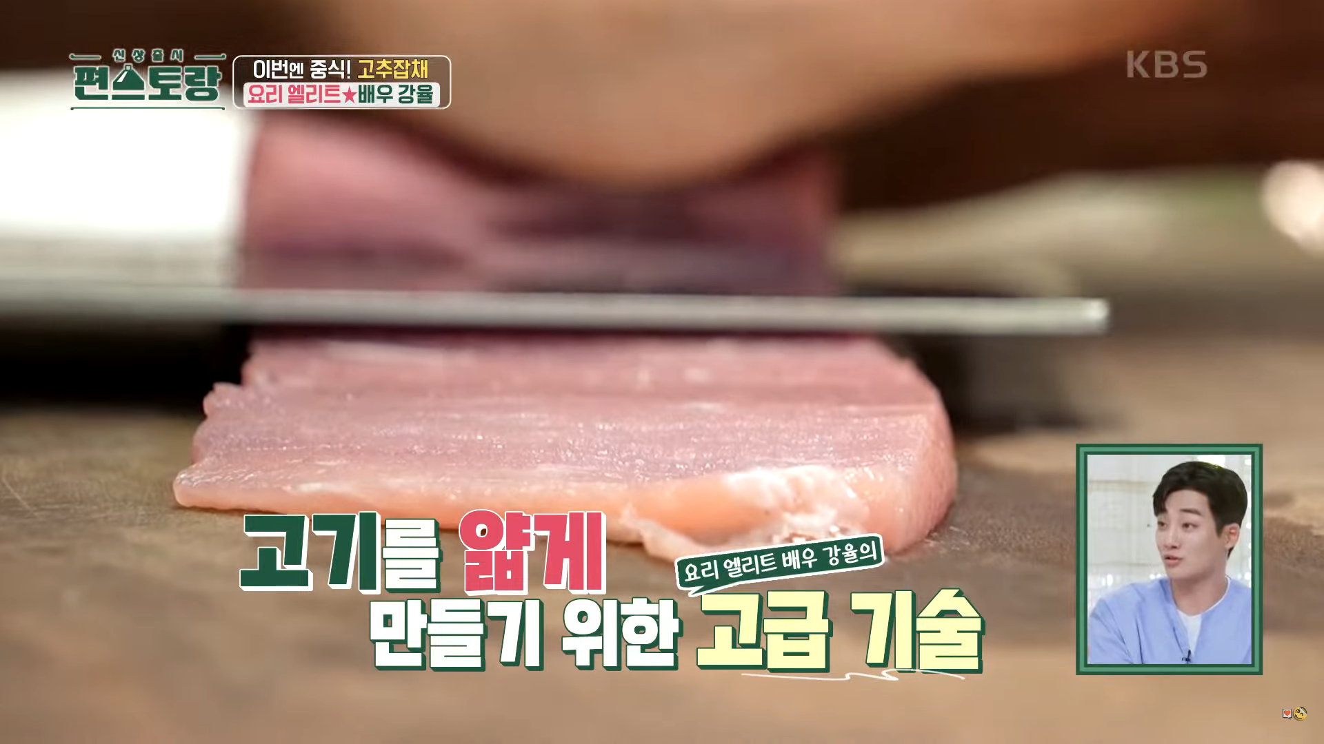편스토랑에 나온 배우 강율 씨가 고추잡채와 함께 먹을 가지튀김을 만들었습니다 고추잡채는 보통 꽃빵과 함께 먹는데 강율 씨는 평소 직접 가지튀김을 만들어서 고추잡채와 함께 먹는다고 합