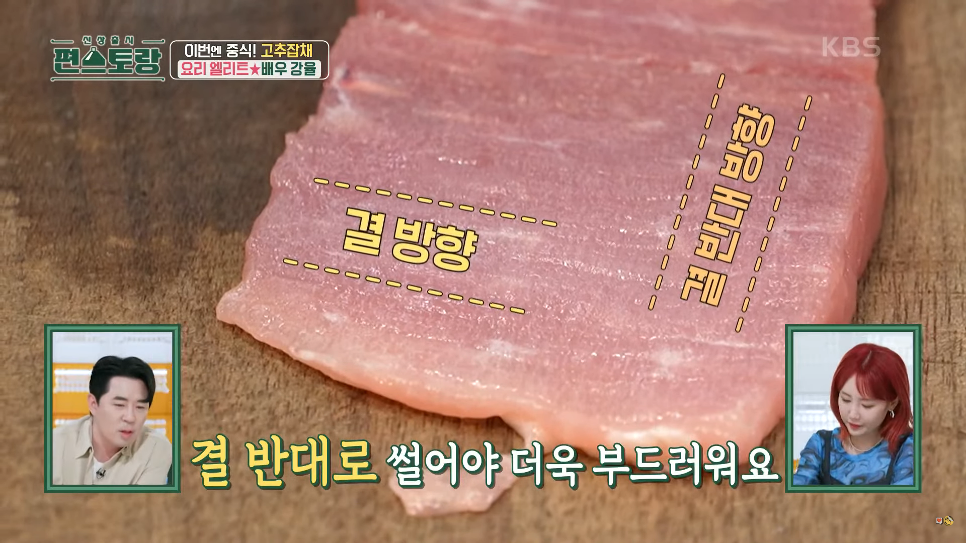 돼지고기를 썰 때 결 반대방향으로 썰어야 더욱 부드럽다고 합니다