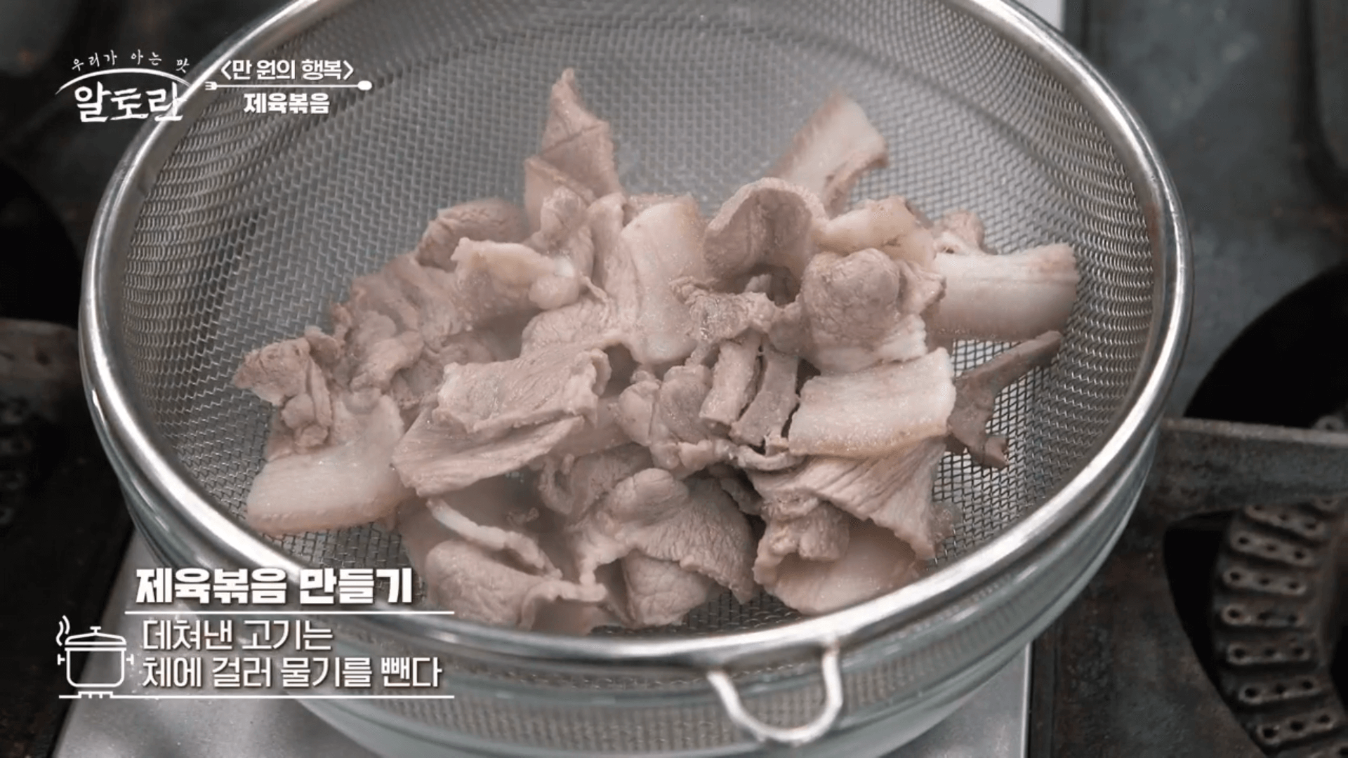 보통 제육볶음을 만들 떄는 돼지고기를 물에 데치지 않고 바로 볶지만 천상현 셰프님은 물기가 없는 최대한 바짝한 제육볶음을 만들기 위해 돼지고기를 한번 데쳐줬습니다