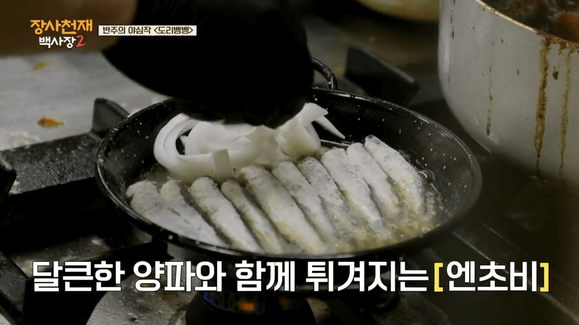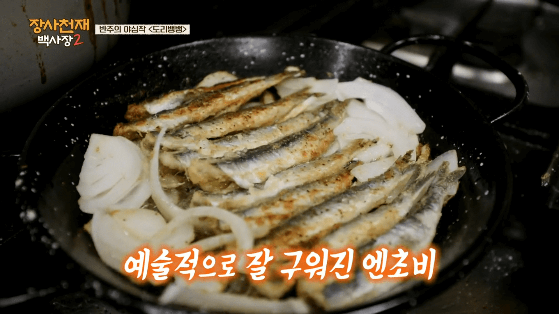 2. 달큰한 양파도 함께 넣어준 뒤 뒤집어가며 엔초비를 구워줍니다