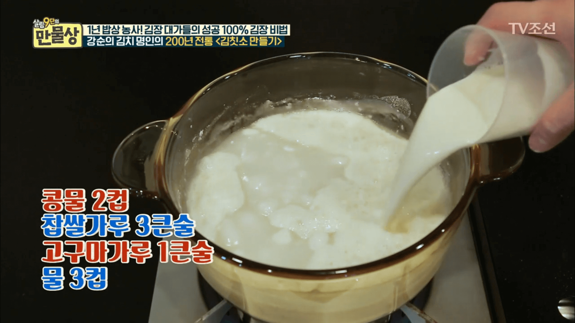 찹쌀풀에 콩물을 넣어서 김치의 부족한 영양소인 단백질을 보충한다니 정말 좋은 김장 비법입니다