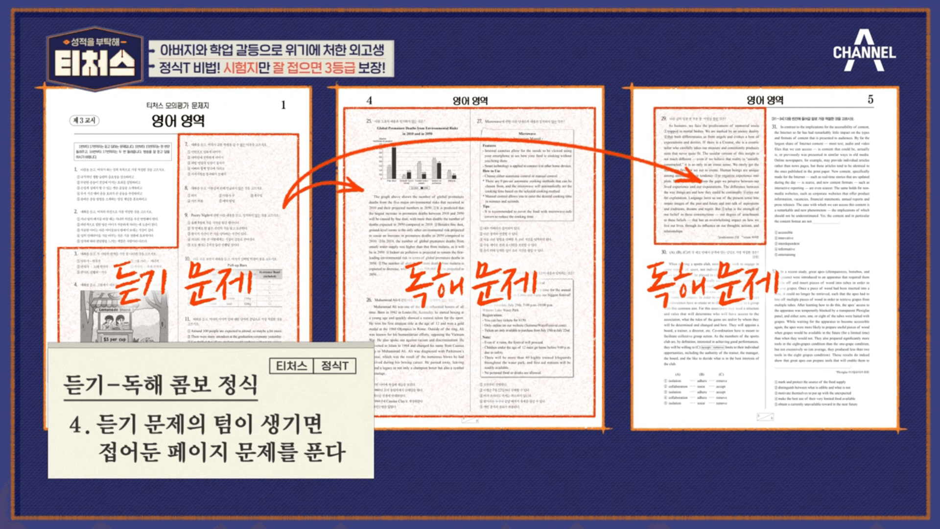 티처스에 나온 조정식 강사님이 수능이나 모의고사 영어 듣기 시간에 독해문제를 같이 푸는 방법도 알려주셨습니다