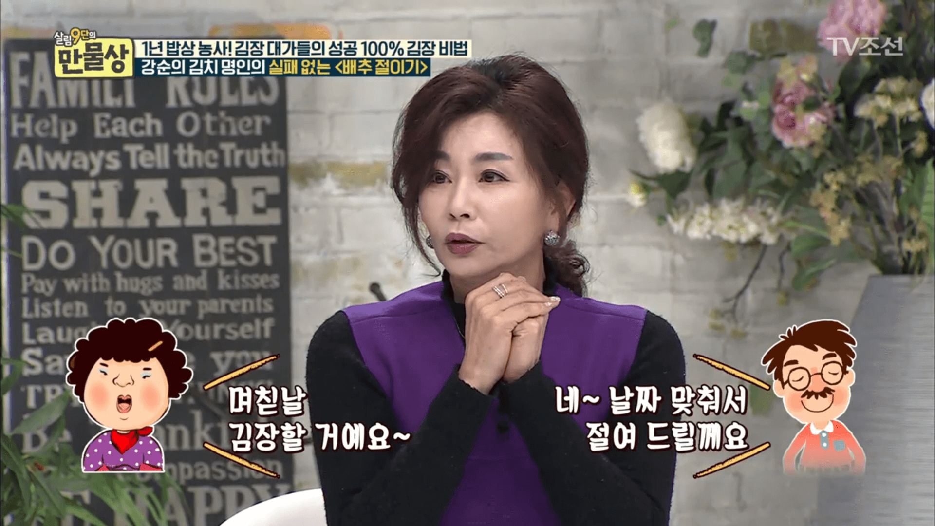살림 9단의 만물상에 나온 김치 명인 강순의 여사님이 김장철 절임배추 주문 시 주의할 점을 알려주셨습니다