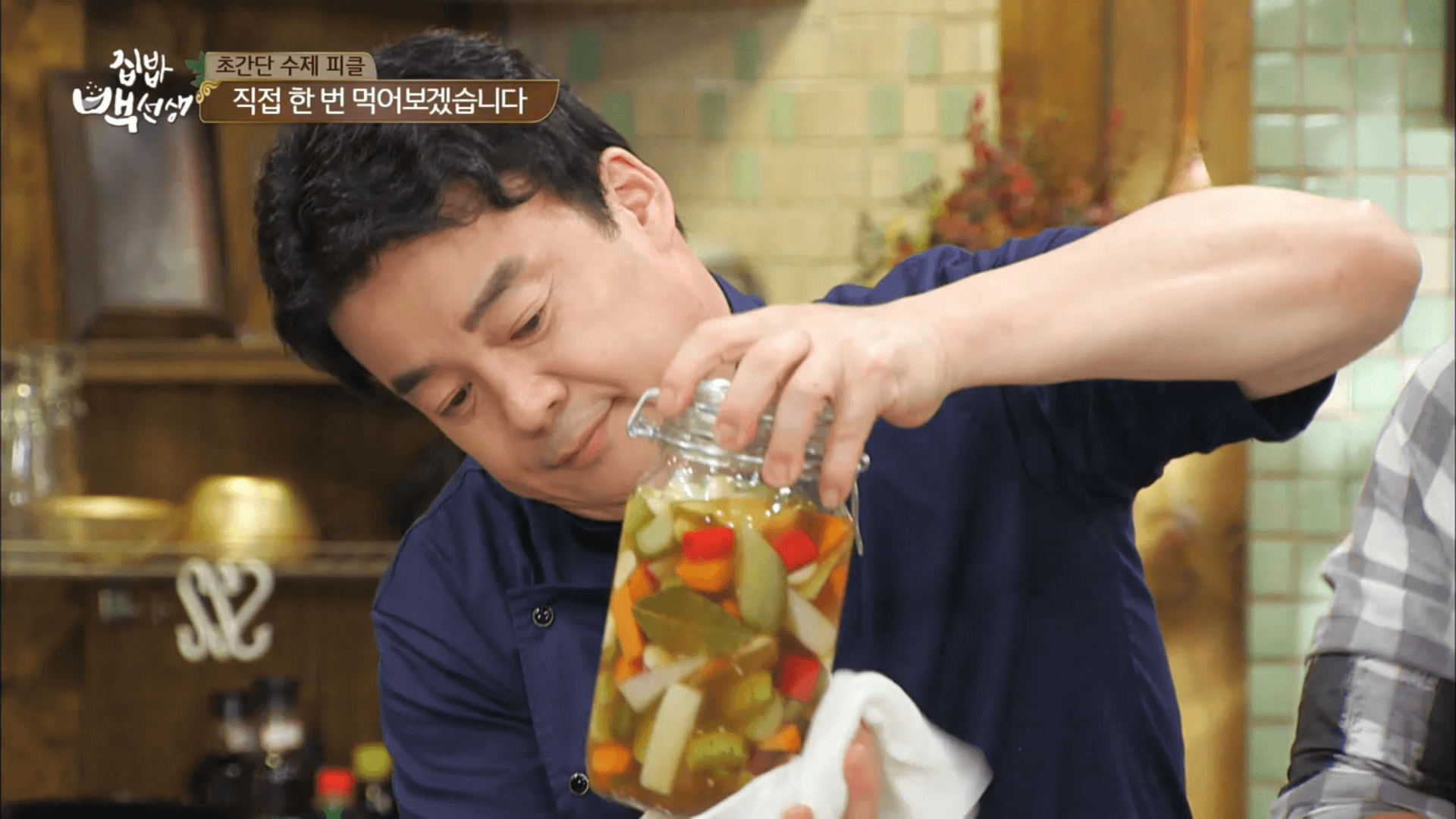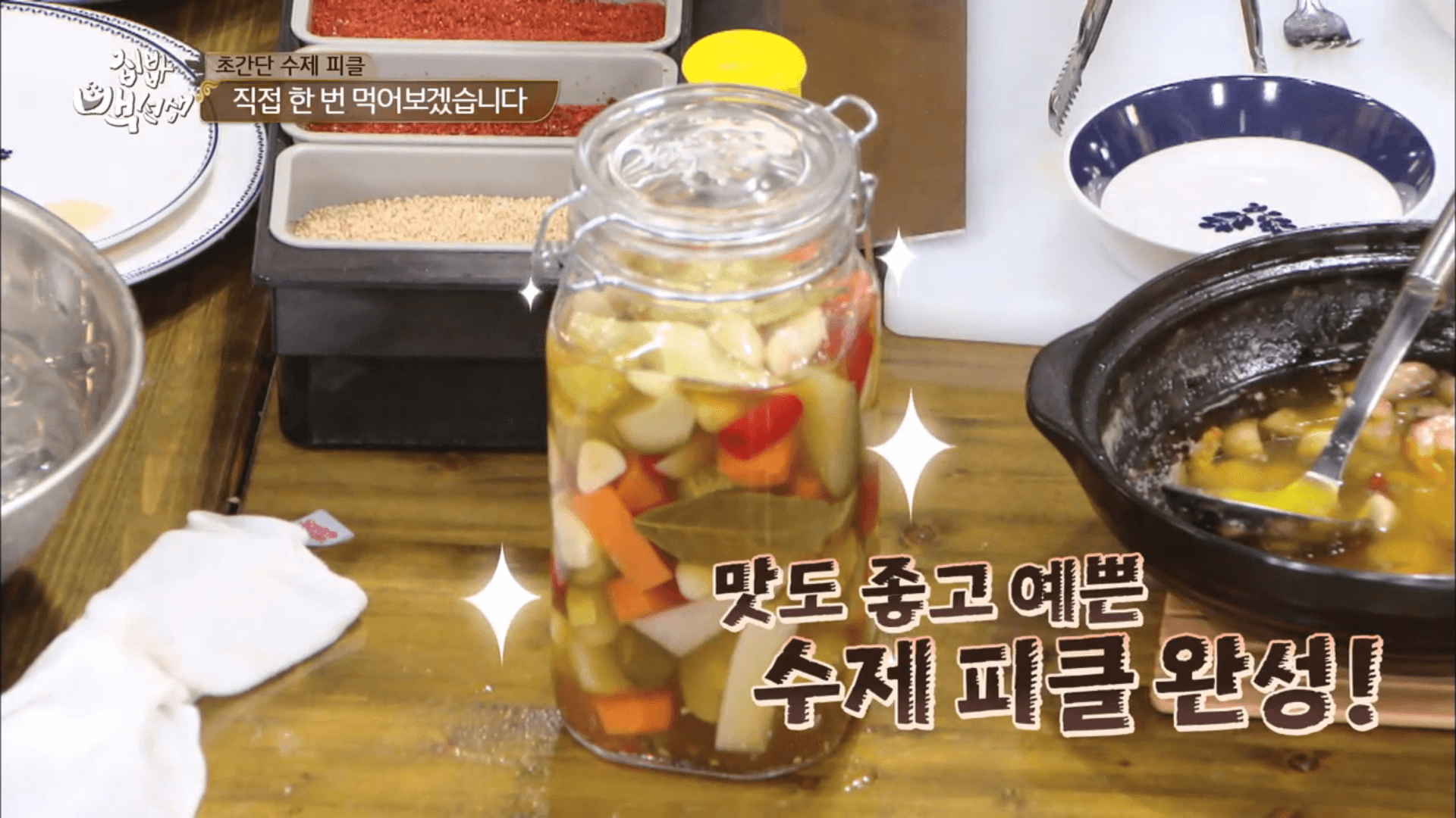 백종원 선생님이 예쁘게 유리병에 담고 유리병에 흘린 피클 국물까지 깨끗하게 닦아줍니다