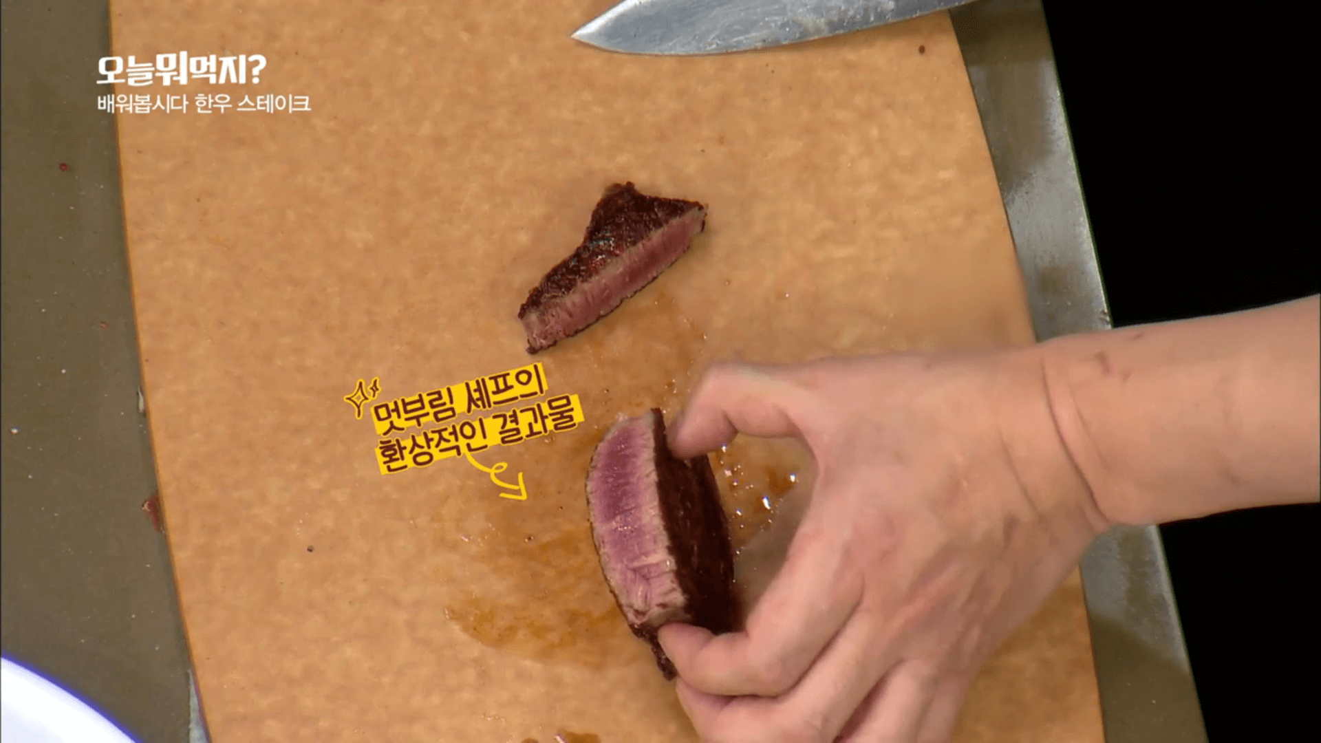최현석 셰프님께서 완성된 안심 스테이크를 잘라보았습니다
