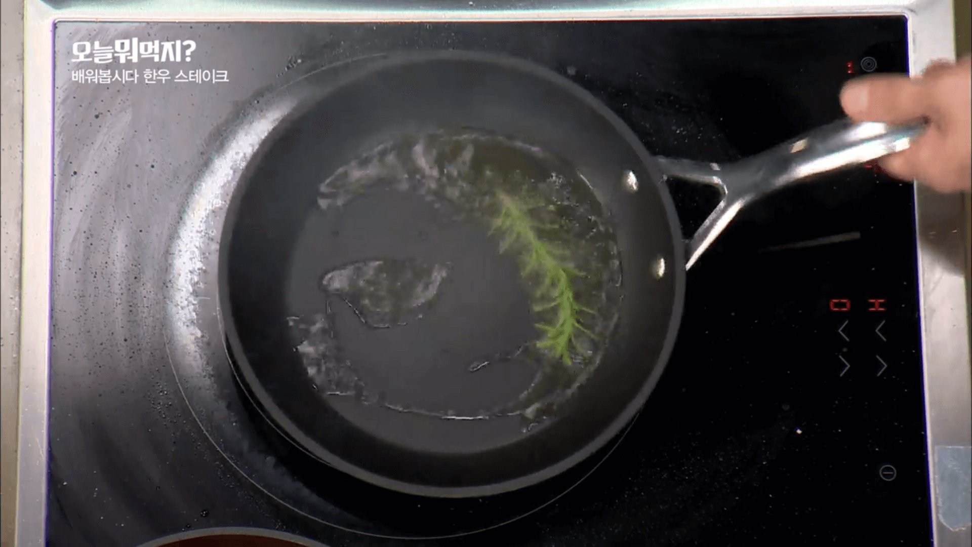 2. 프라이팬에 올리브오일을 두르고 로즈마리를 띄워줍니다