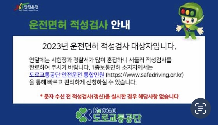올해 3월 초에 도로교통공단에서 2023년 운전면허 적성검사 대상자라고 문자가 왔습니다