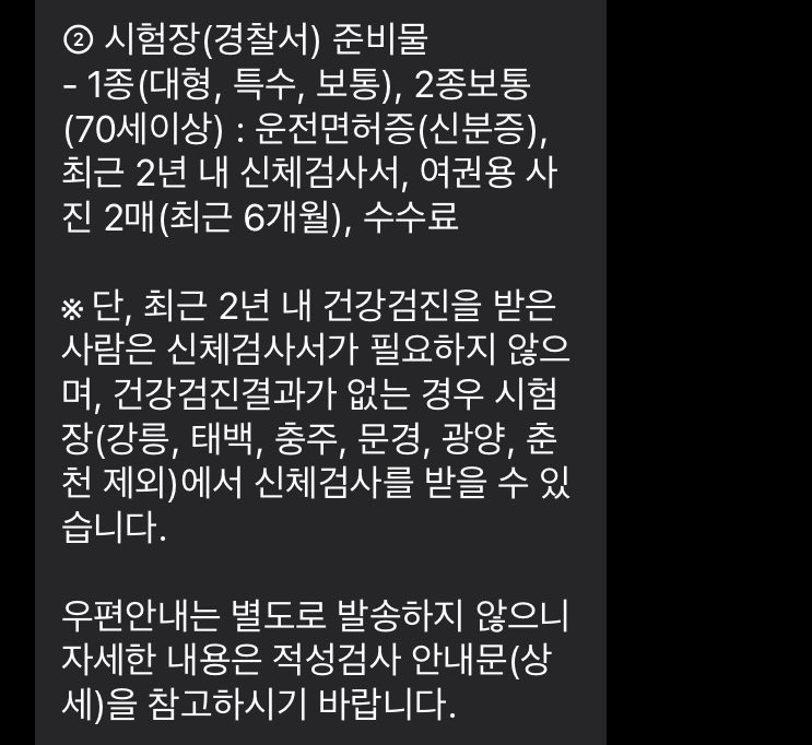 단, 최근 2년 내 건강검진을 받은 분은 신체검사서가 필요하지 않고 건강검진 결과가 없는 경우 시험장에서 신체검사를 받을 수 있지만 강릉, 태백, 충주, 문경, 광양, 춘천 지역 시험장은 제외라고 합니다
