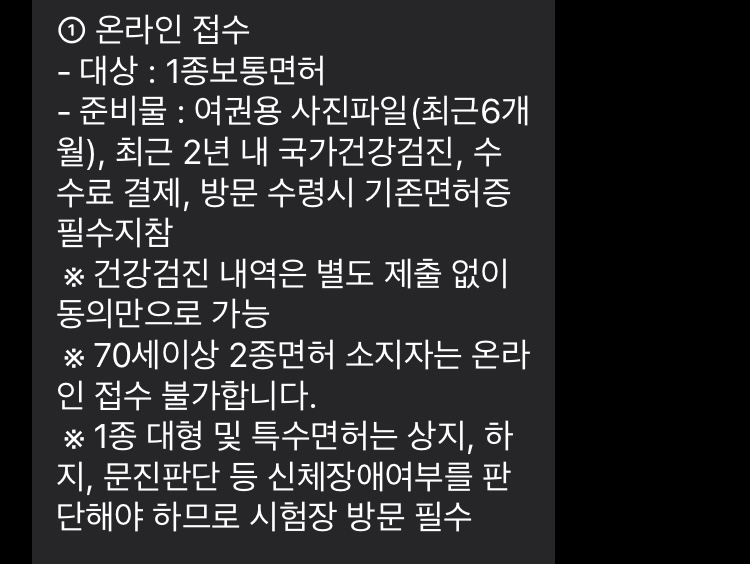 온라인 접수 시에는 여권용 사진파일과 최근 2년 내 국가건강검진이 있어야 하고 수수료 결제가 필요하며 방문 수령 시 기존 면허증을 지참하셔야 합니다