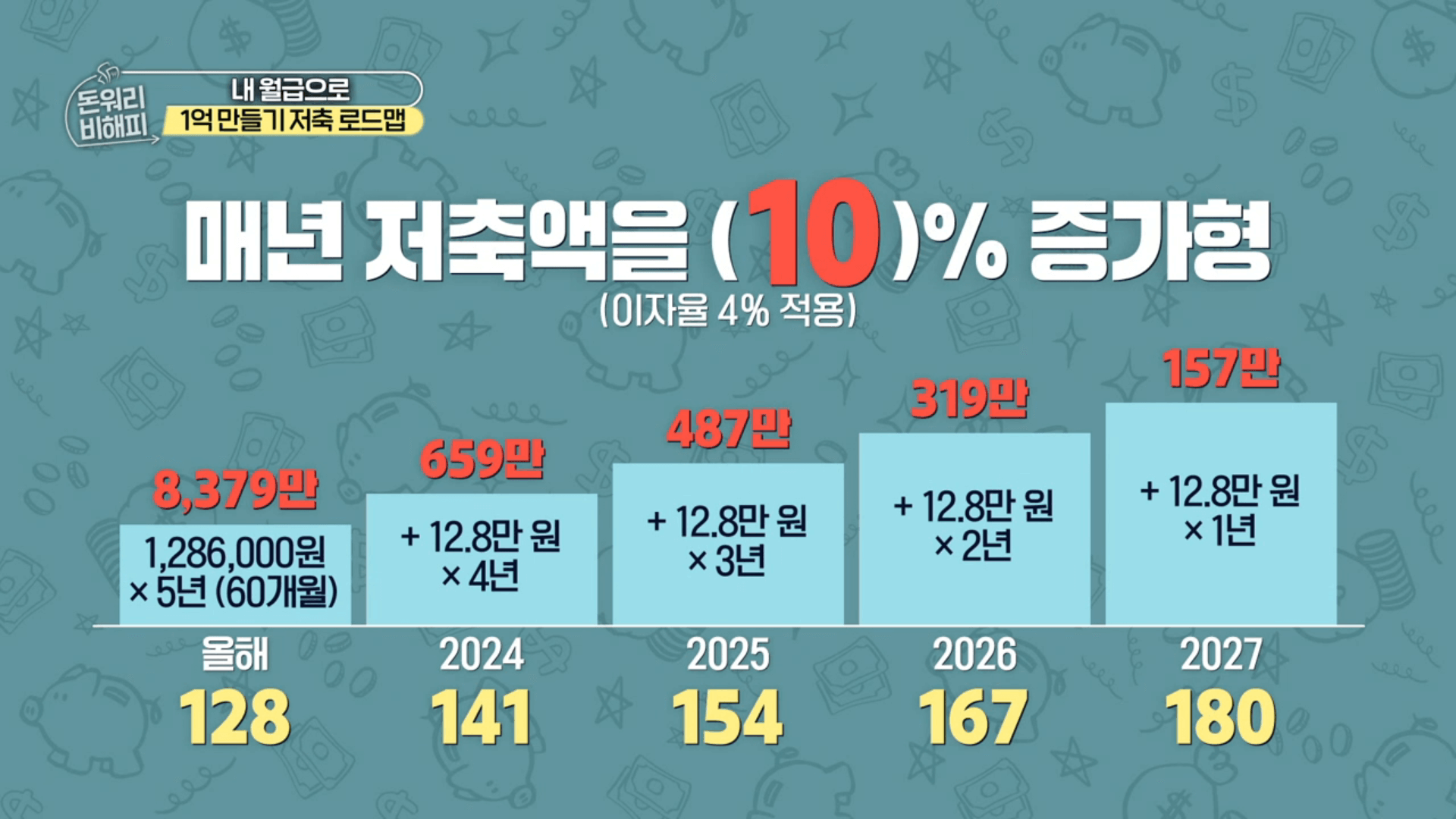 적금을 128만 원으로 시작해서 5년 차에는 180만 원으로 저축액이 커졌지만 이렇게 해서 5년 동안 1억을 모을 수 있다니 좋은 방법인 것 같습니다