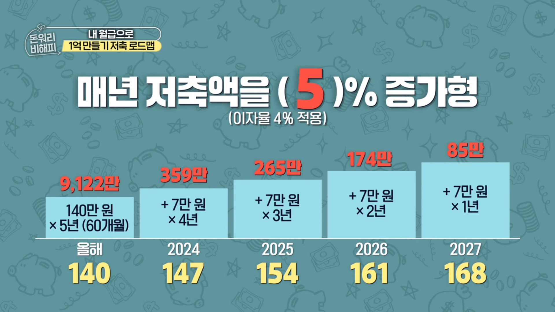 첫 해 140만 원을 시작으로 매년 5%씩 저축액을 증가시키는 방법인데요