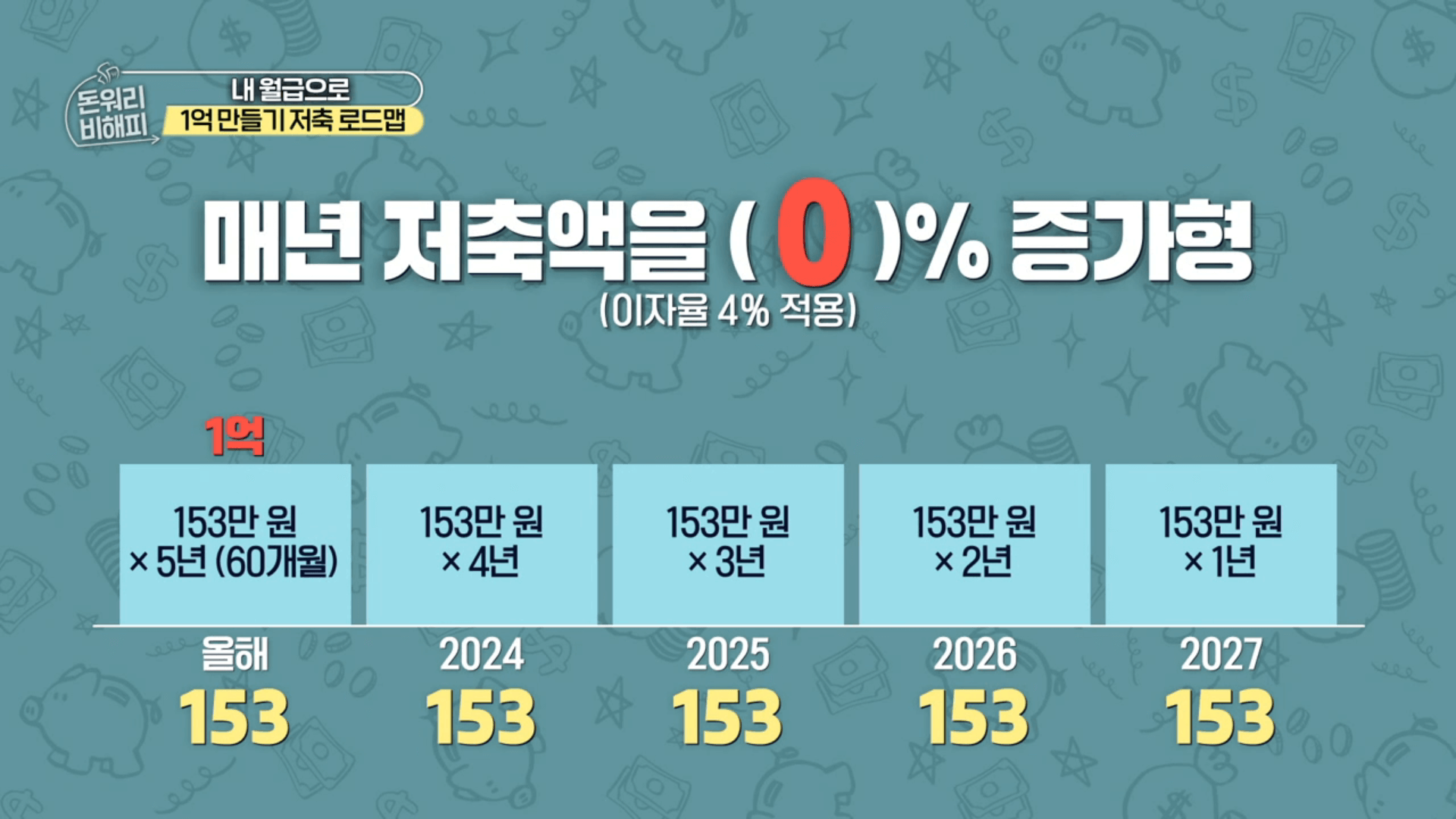 첫 번째 방법은 5년 동안 153만 원씩 매달 저축을 하면 1억이 모아진다고 합니다