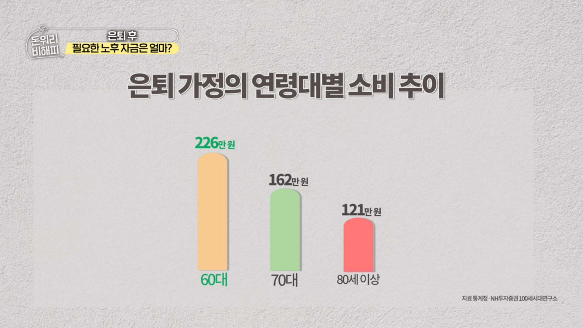 60대의 경우 월 226만 원, 70대의 경우 월 162만 원, 80세 이상의 경우 121만 원으로 나이가 들수록 은퇴 가정의 연령대별 소비 추이가 감소하는 경향을 보입니다