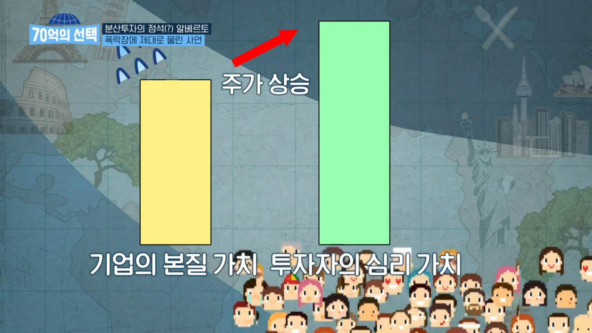 이런 상황에서는 아무리 본질 가치가 높은 회사라 할지라도 지나친 관심의 증대로 투자자의 심리 가치가 올라가면서 과대평가되어 그 관심이 꺼지는 순간 주가가 떨어질 수밖에 없다고 합니다