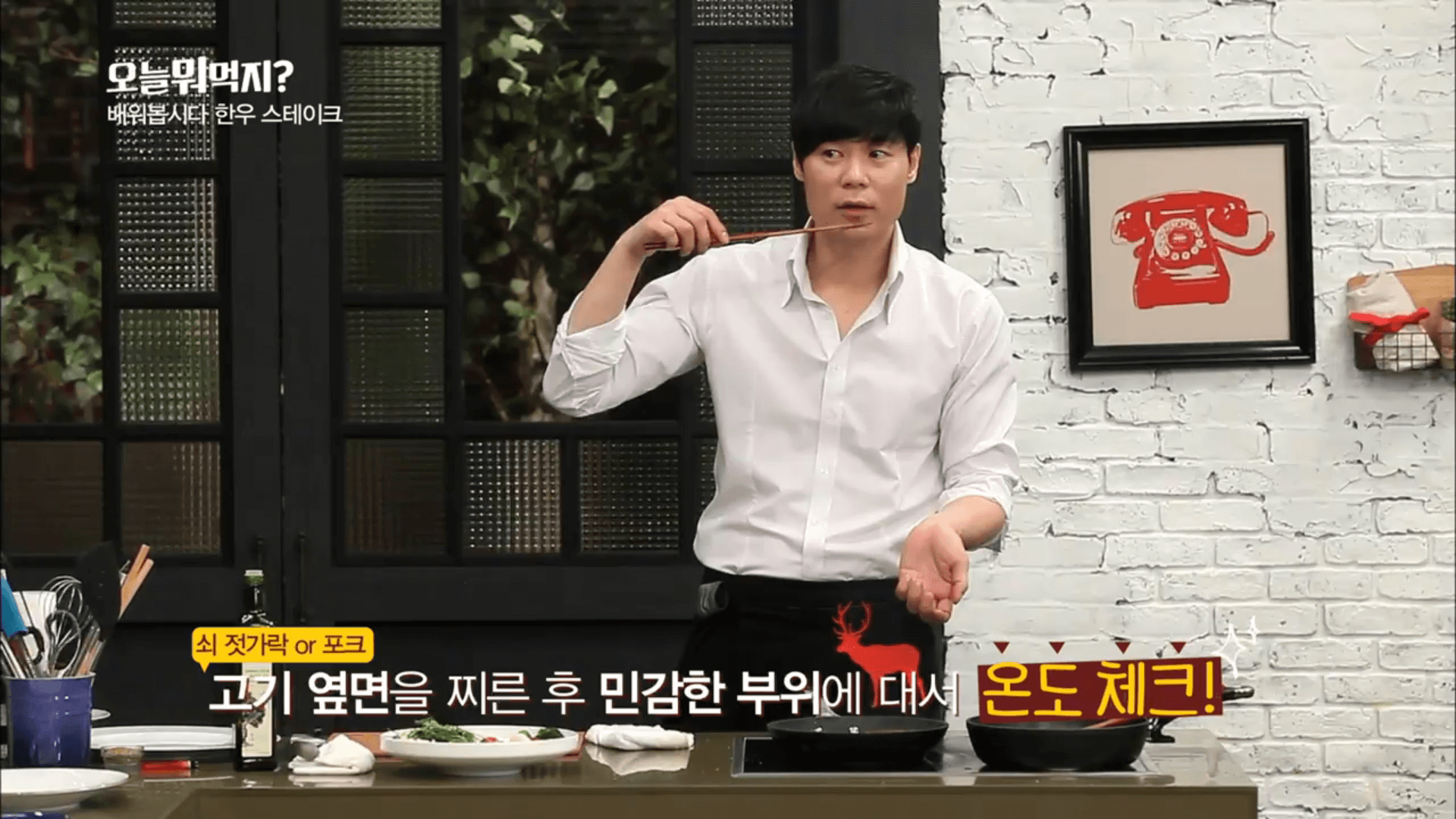 고기 옆면을 찌른 쇠 젓가락이나 쇠 포크를 민감한 부위에 대서 온도를 체크해 줍니다