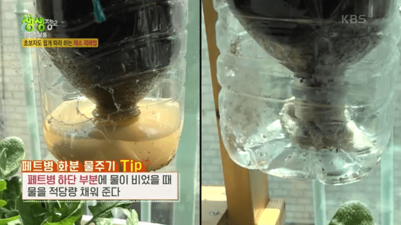 페트병으로 만든 화분에 상추를 키우는 방법은 페트병 하단에 물이 비었을 때 물을 적당량 채워주면 되는데요