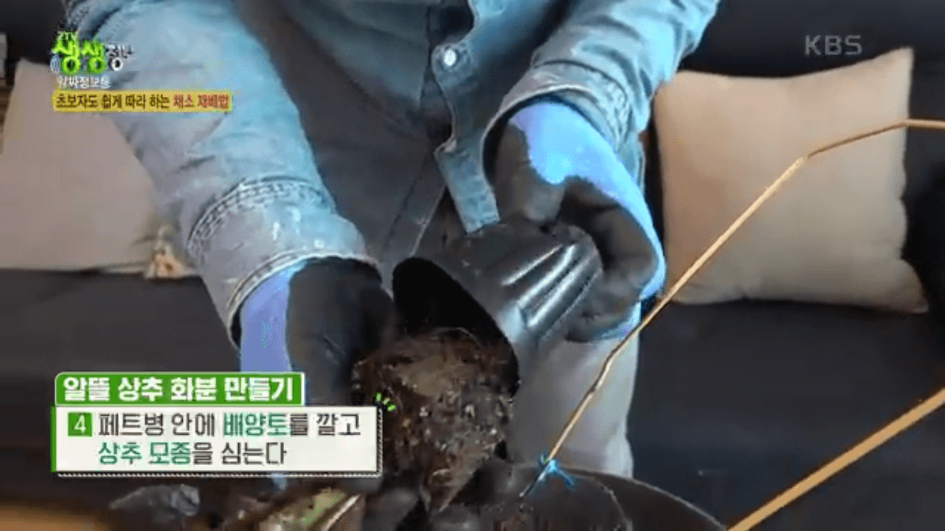 4. 페트병 안에 배양토를 깔고 초보도 키우기 쉽다는 상추 모종을 심어주면 완성입니다