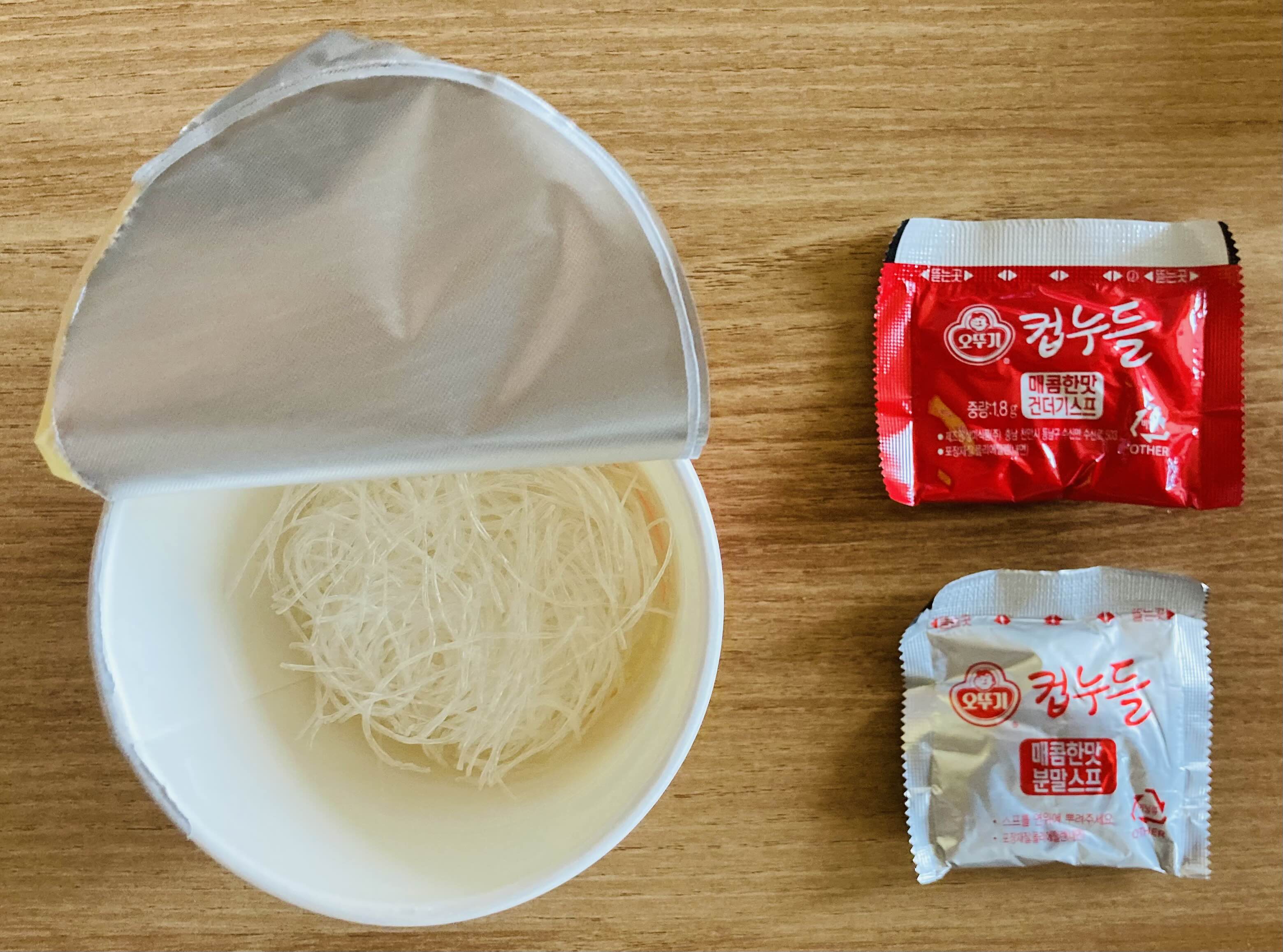 컵누들 안에는 당면과 건더기스프, 분말스프가 들어있습니다