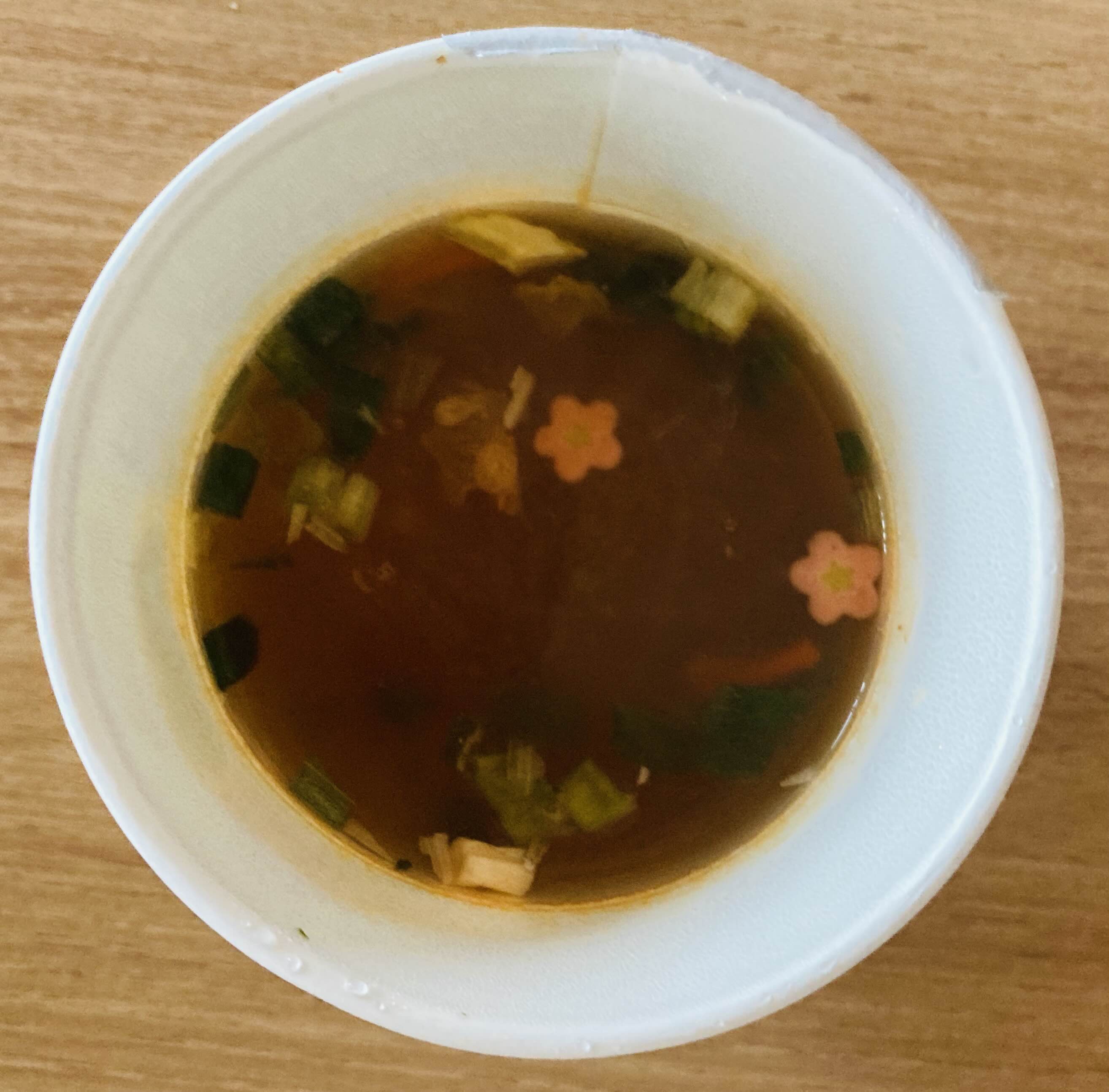 국물은 보기에는 보통 컵라면 국물보다 진하지 않아 밍밍한 맛일 것 같지만 칼칼한 매운맛에 싱겁지 않습니다