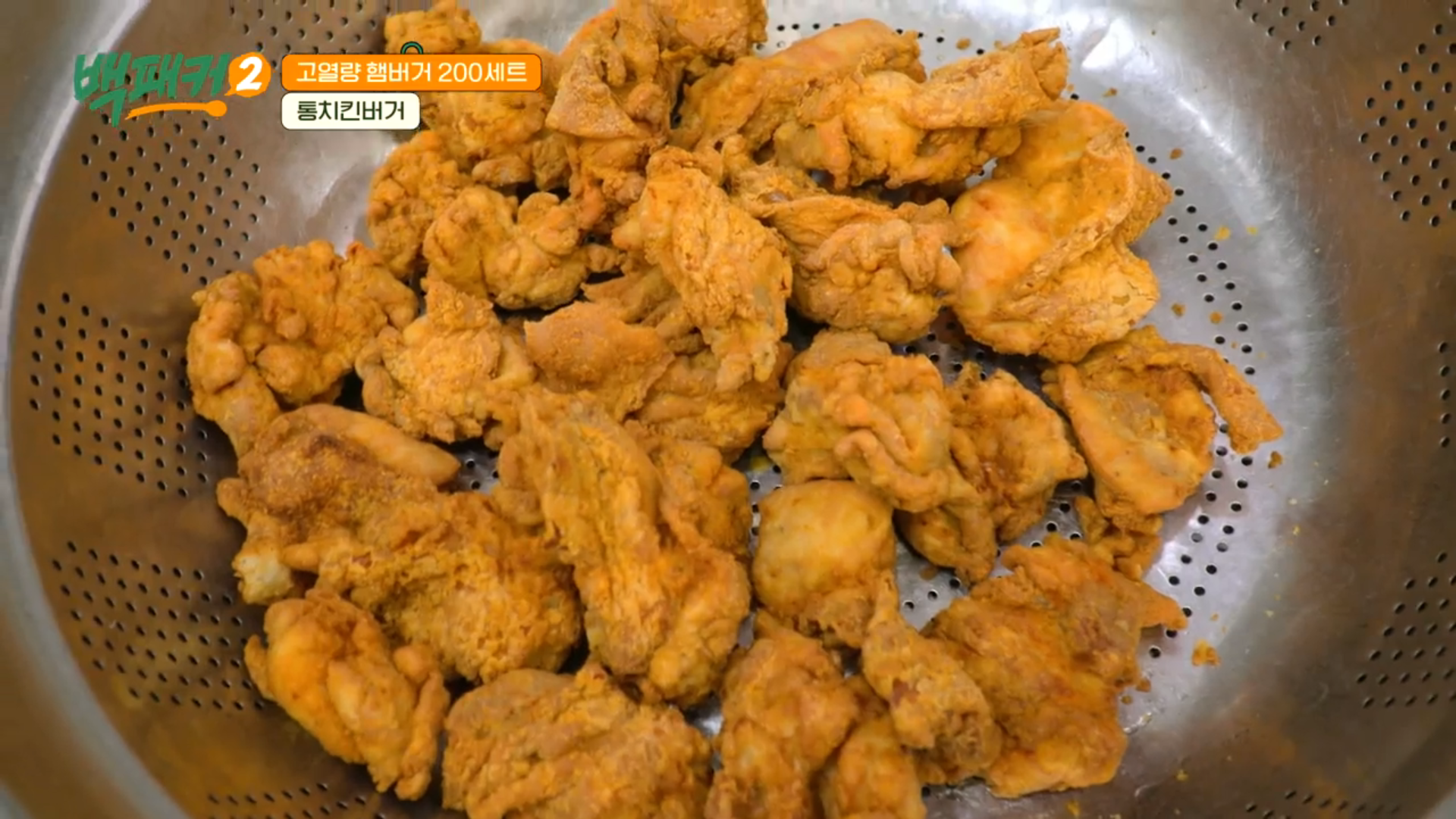 튀김가루를 묻힌 닭고기를 바삭바삭하게 튀겨주면 치킨버거에 넣을 치킨패티가 완성됩니다