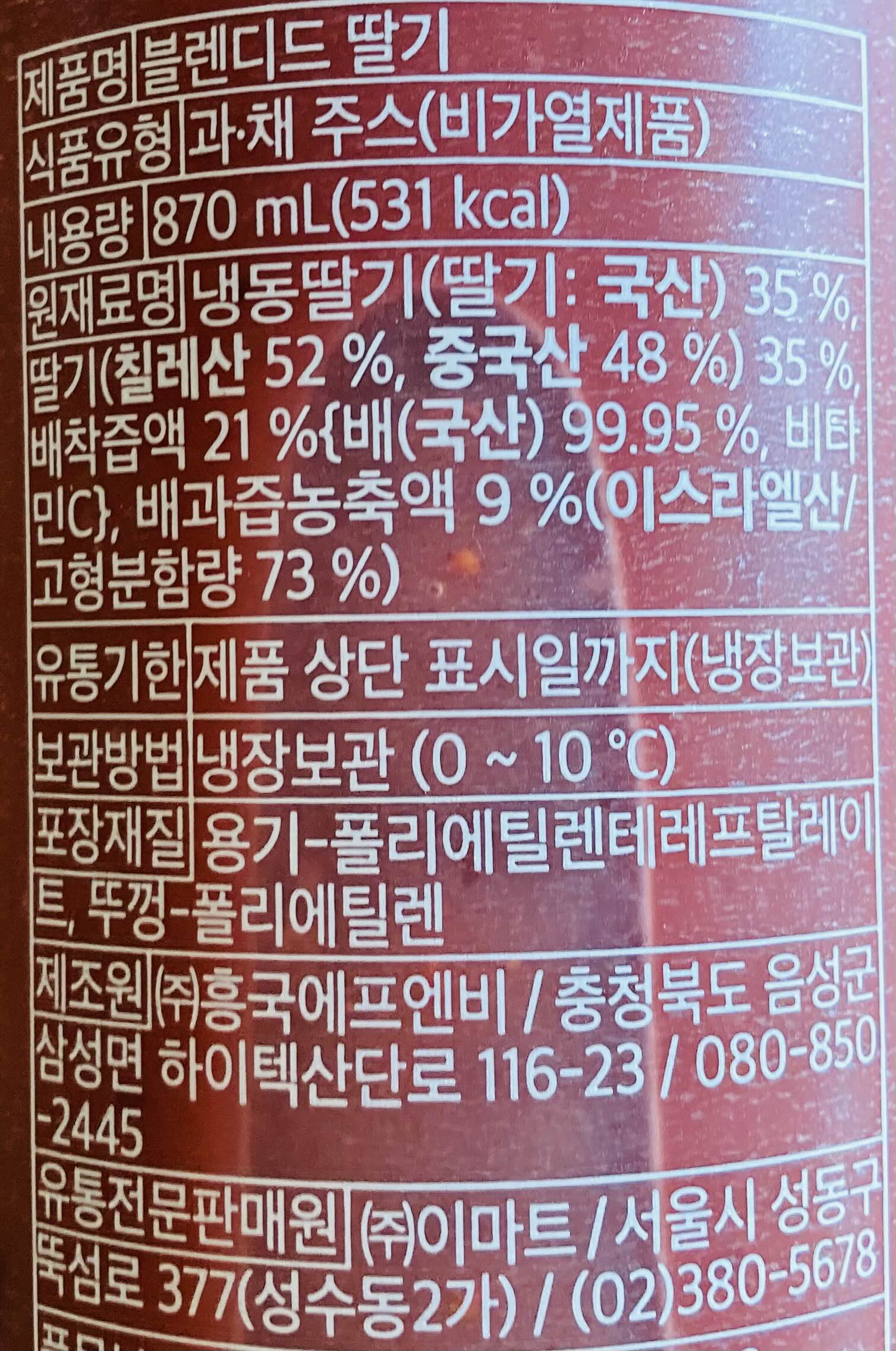 원재료에는 냉동딸기 35%와 딸기 35%, 배착즙액, 배과즙농축액이 들어있습니다