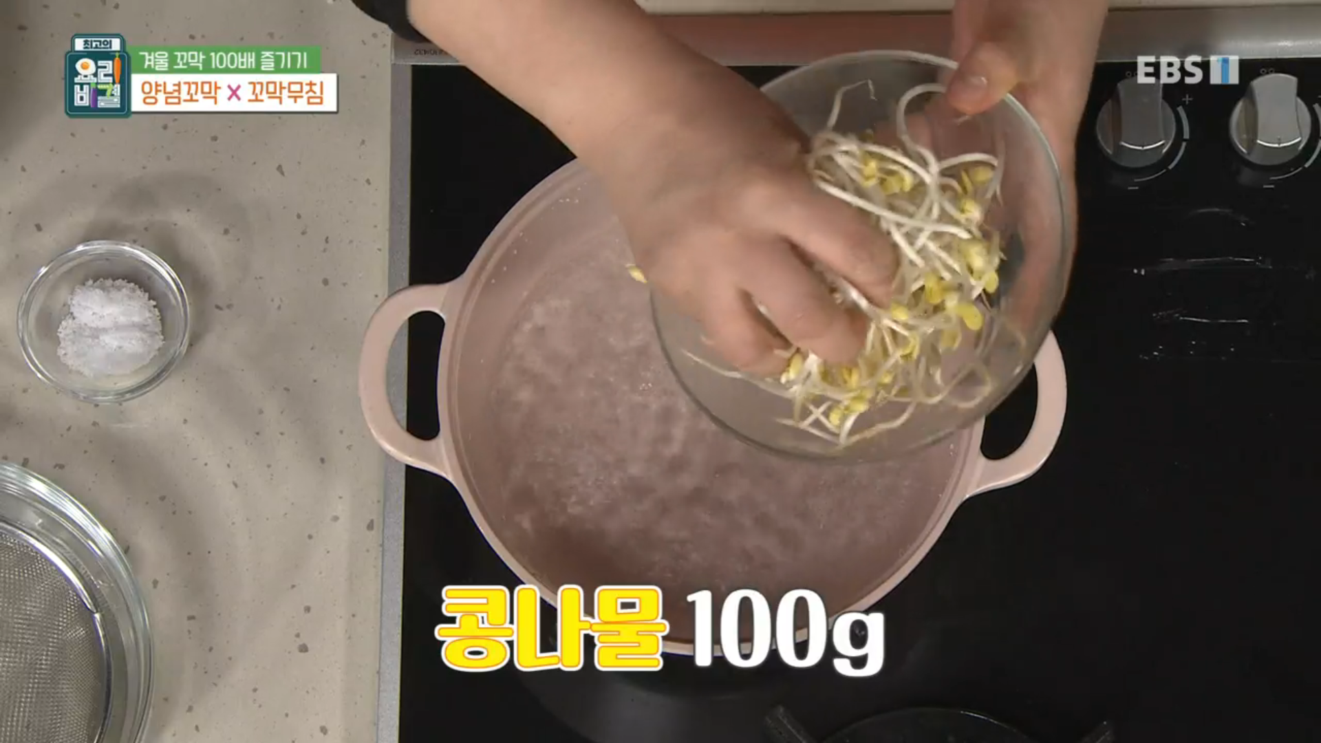 콩나물 100g을 끓는 물에 넣고 콩나물 비린내를 제거하기 위해 뚜껑을 열고 투명한 색이 될 때까지 살캉살캉하게 익혀줍니다