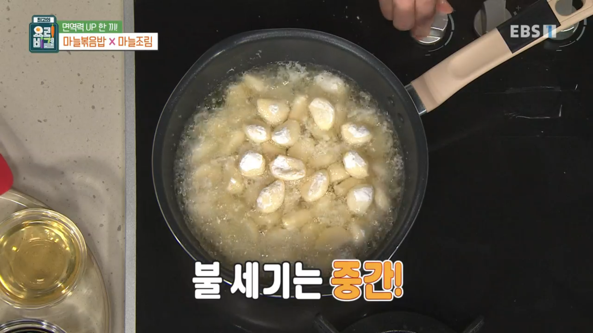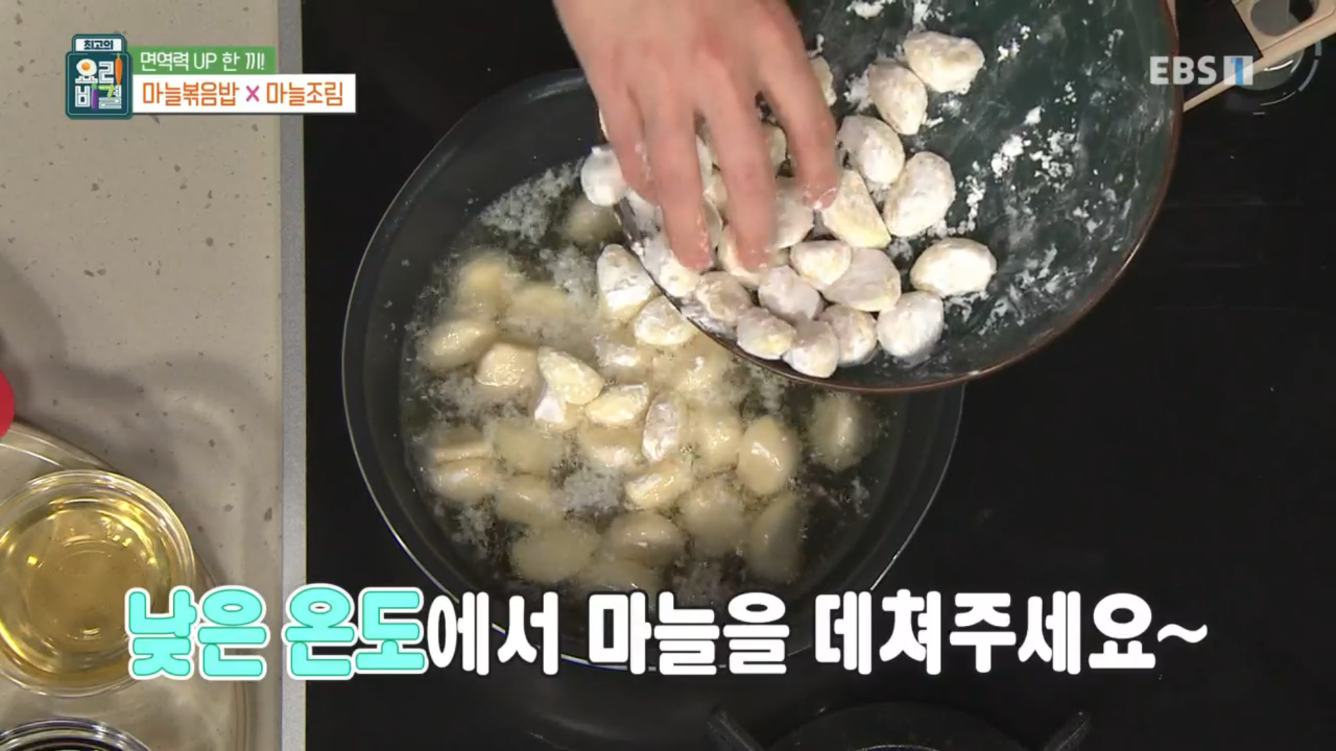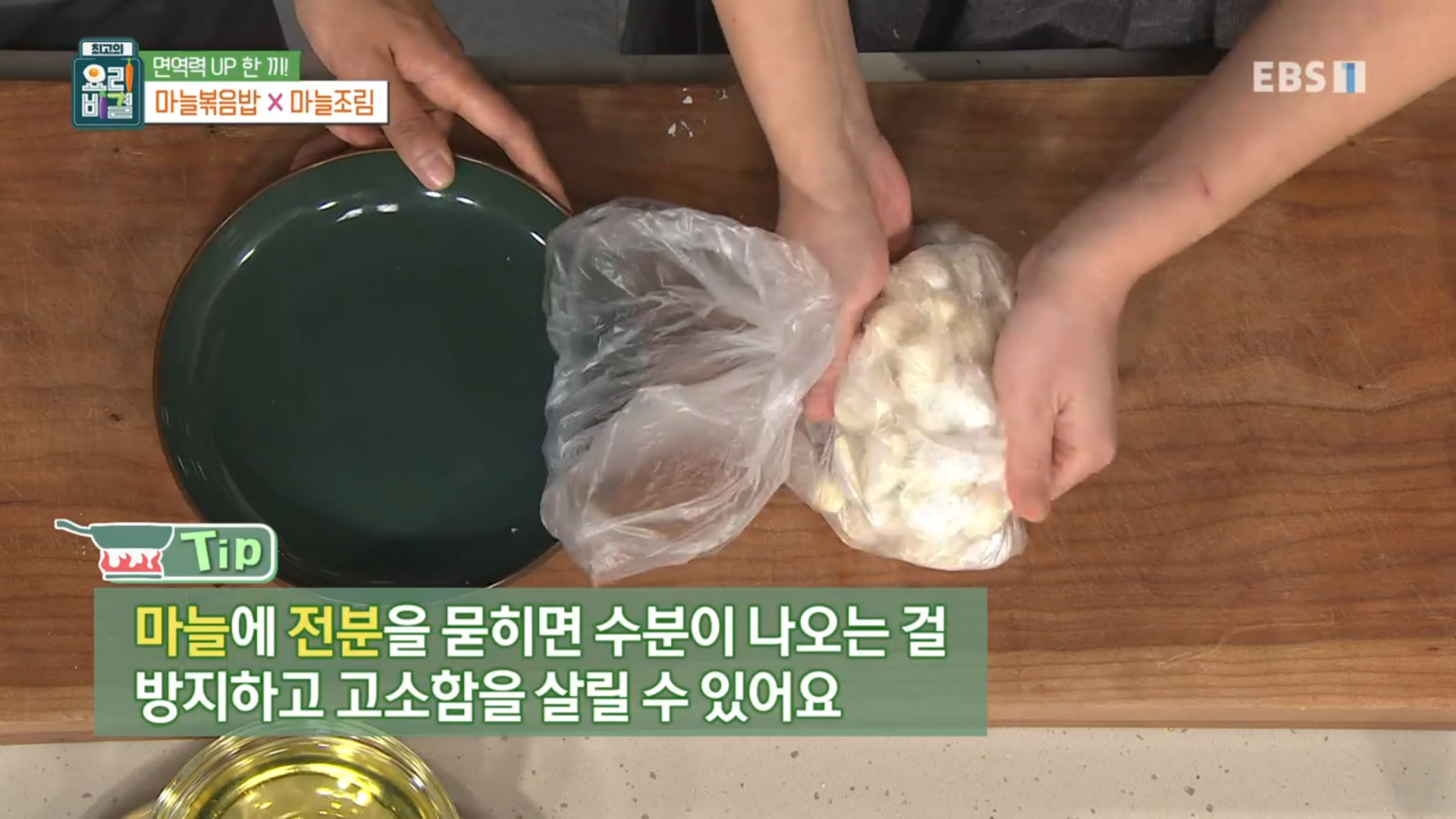 마늘에 전분가루를 묻혀주는 이유는 마늘에 전분을 묻히면 수분이 나오는 걸 방지하고 고소함을 살릴 수 있다고 합니다
