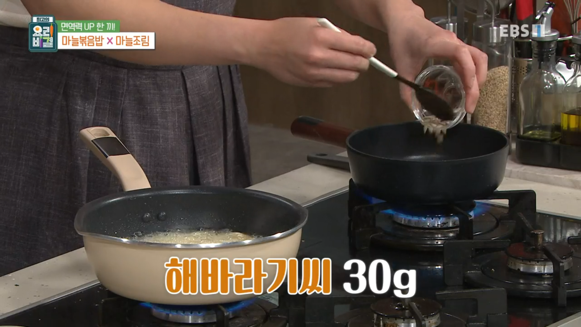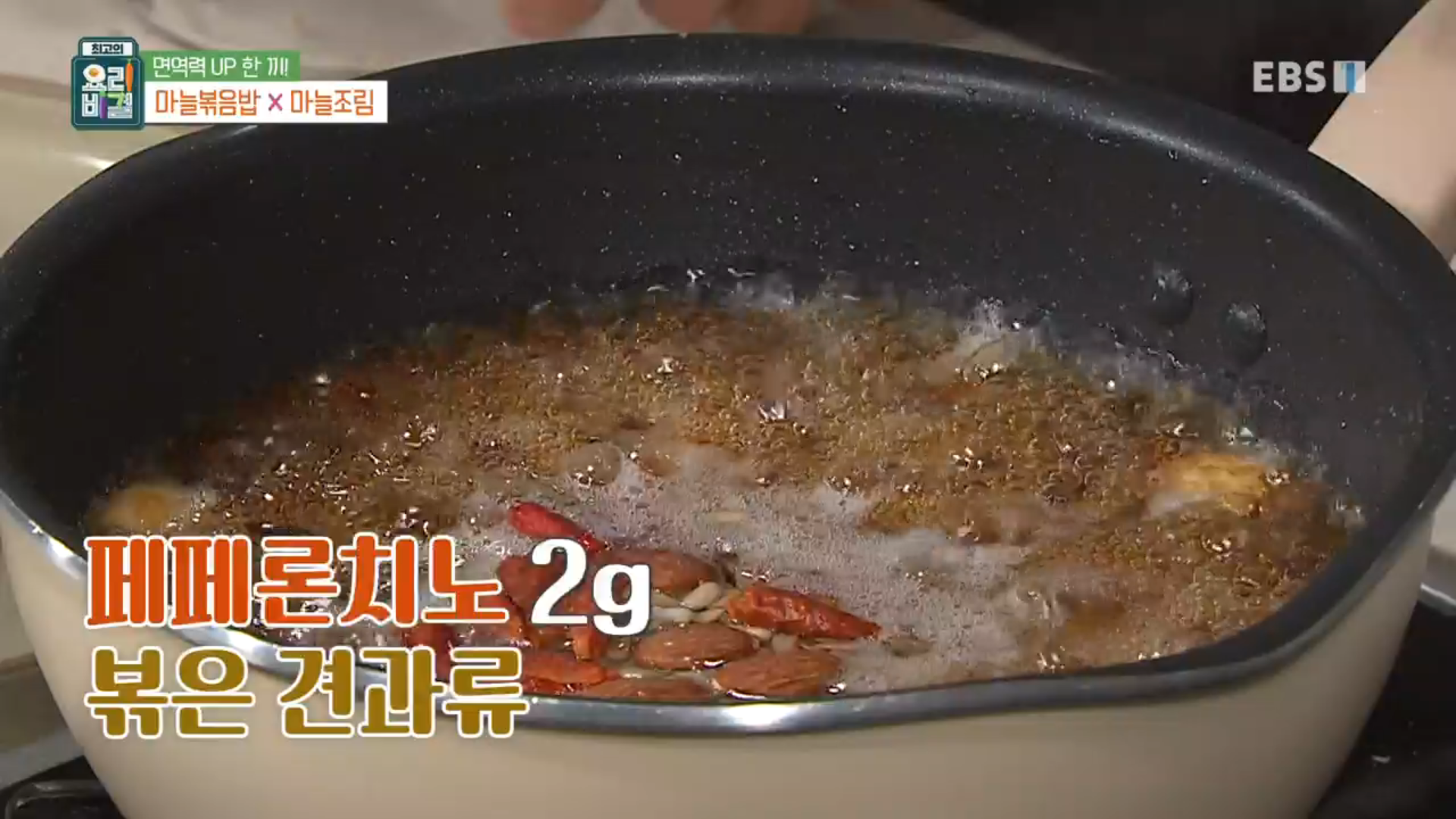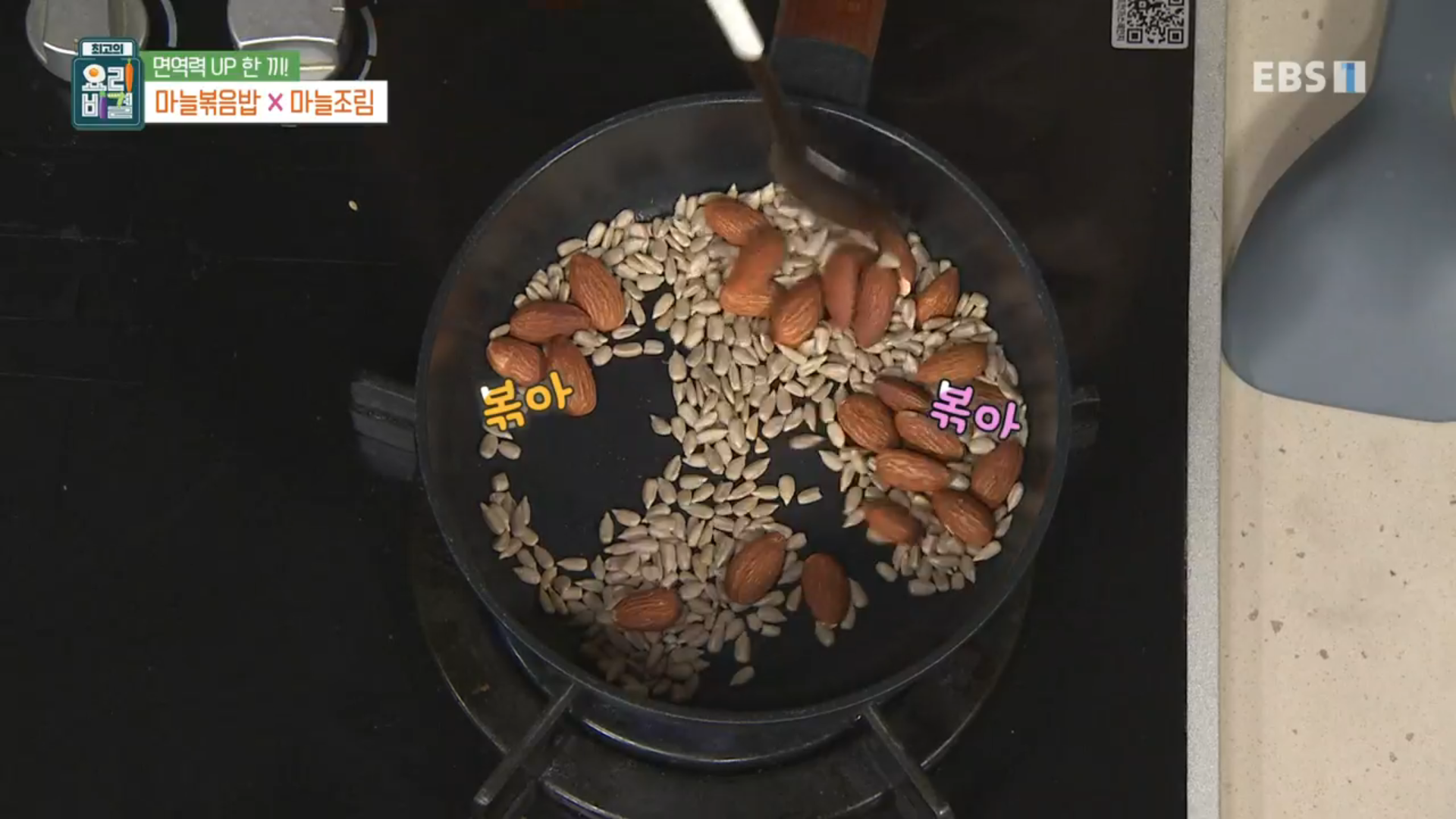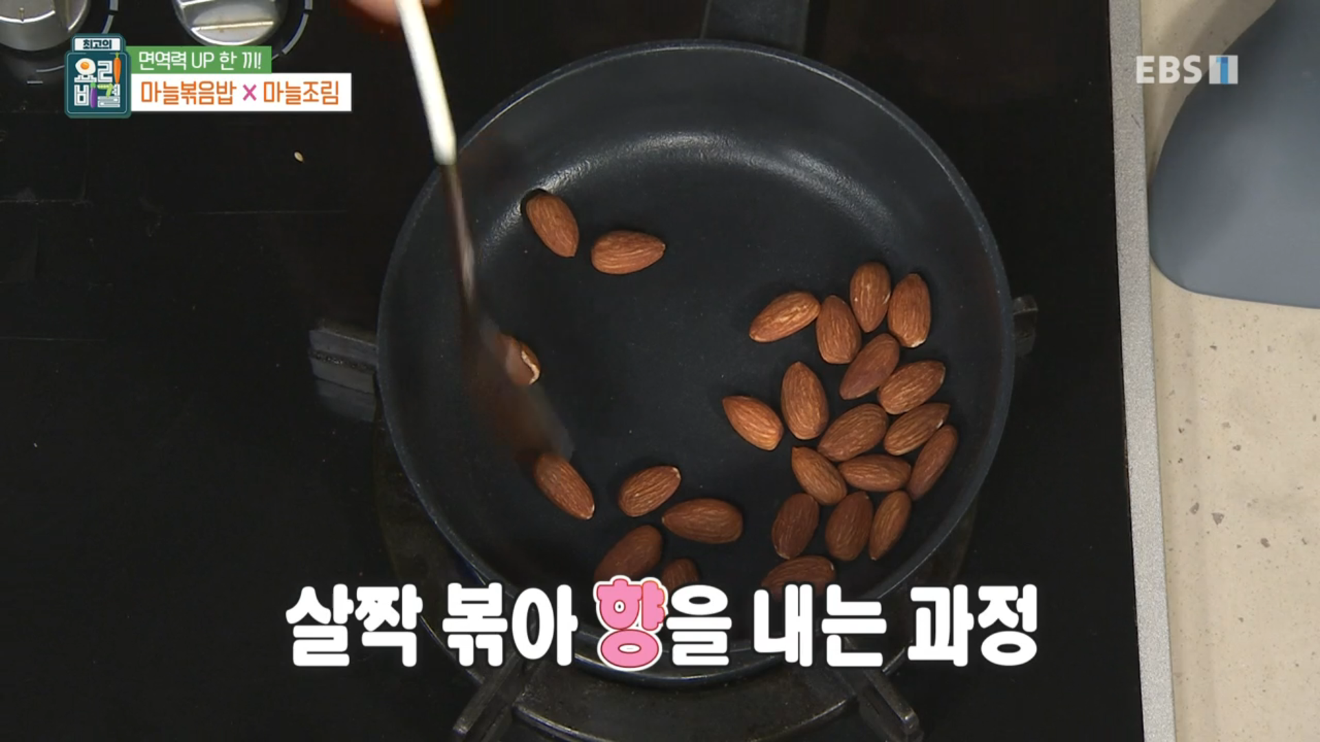 마늘을 익히는 동안 견과류를 볶아줍니다