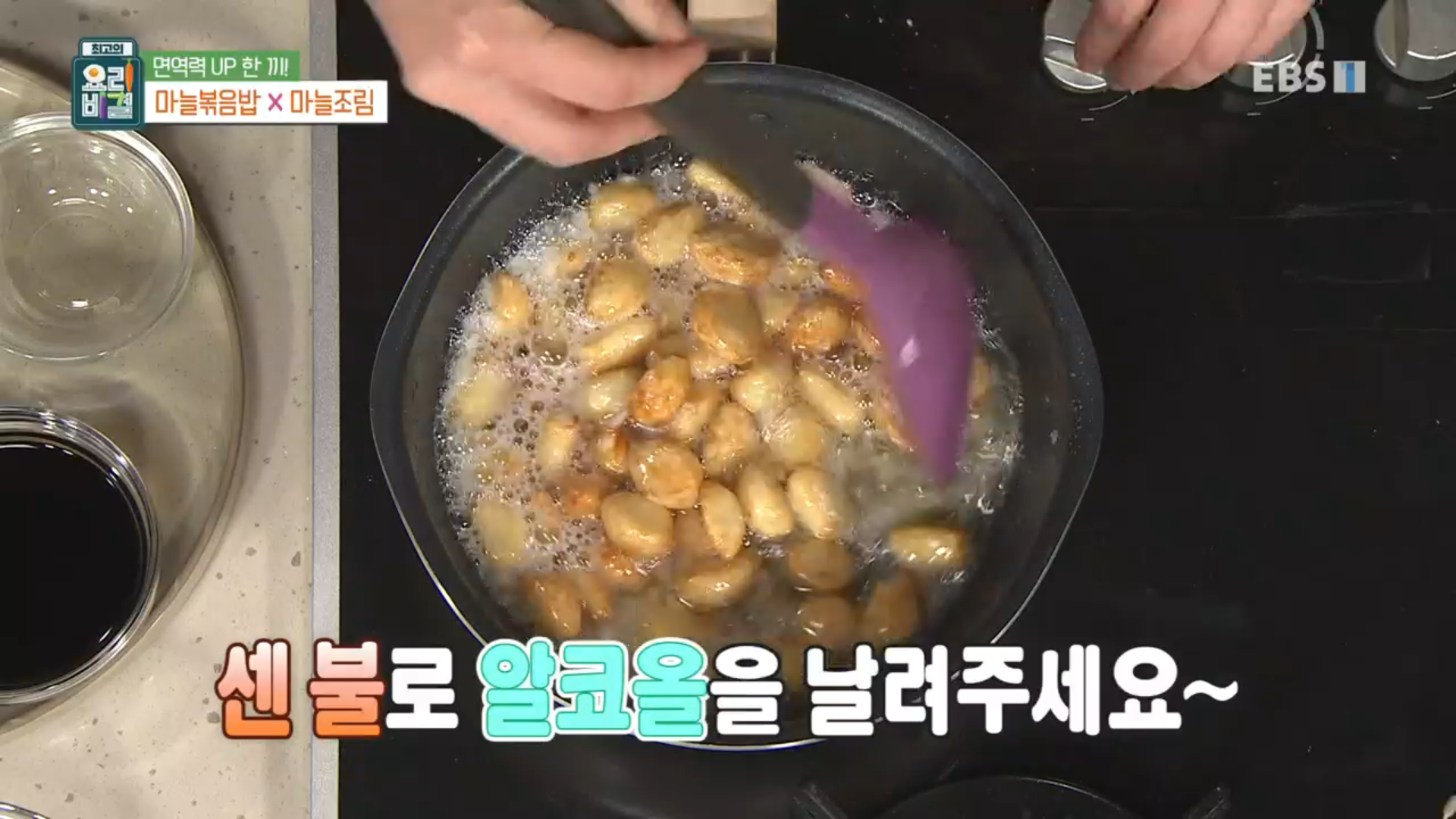 노릇노릇하게 익은 마늘에 맛술 8큰술을 넣어주고 센 불로 알코올을 날려줍니다