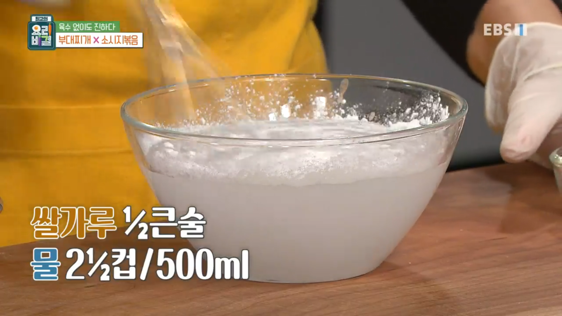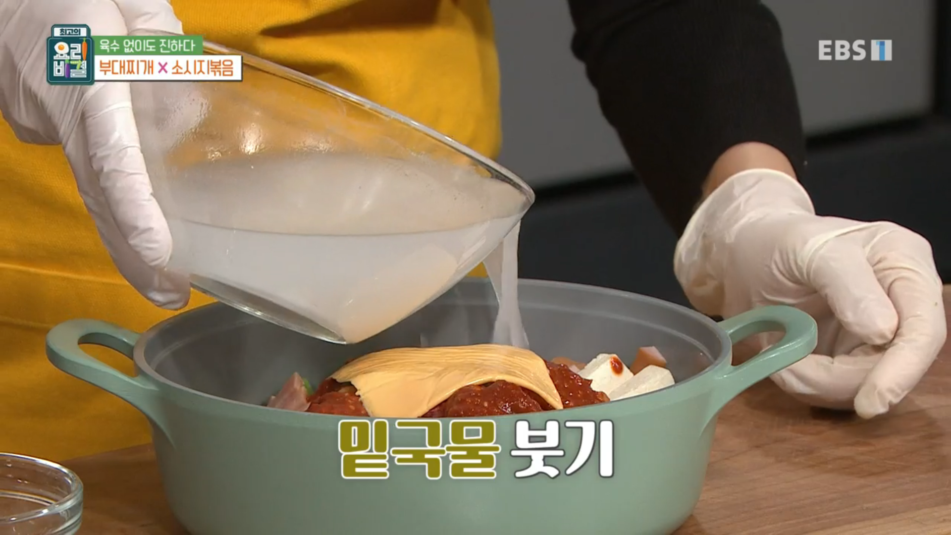 보통 부대찌개 육수로 사골이나 쌀뜨물을 많이 사용하지만 당장 사골이나 쌀뜨물이 없을 때 간단하고 시원한 부대찌개 밑국물을 만들 수 있는 비법을 최고의 요리비결에 나온 유귀열 요리연구가님이 알려주셨습니다
