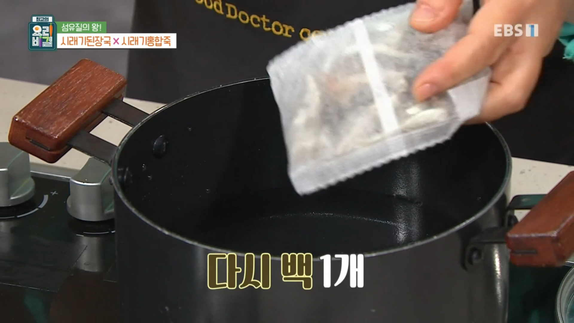 10분 정도 끓여준 육수 냄비에 다시 백을 건져주고 시래기를 볶던 냄비에 육수를 부어줍니다