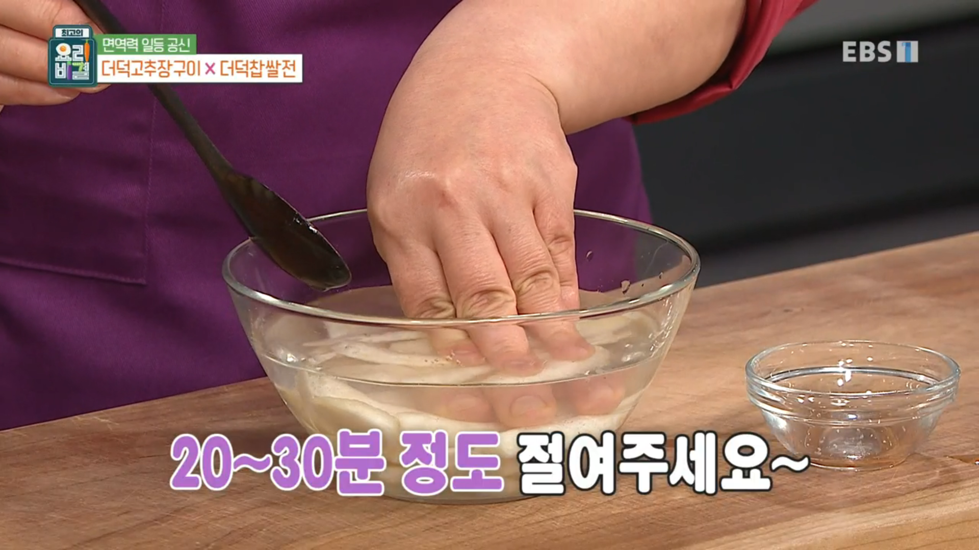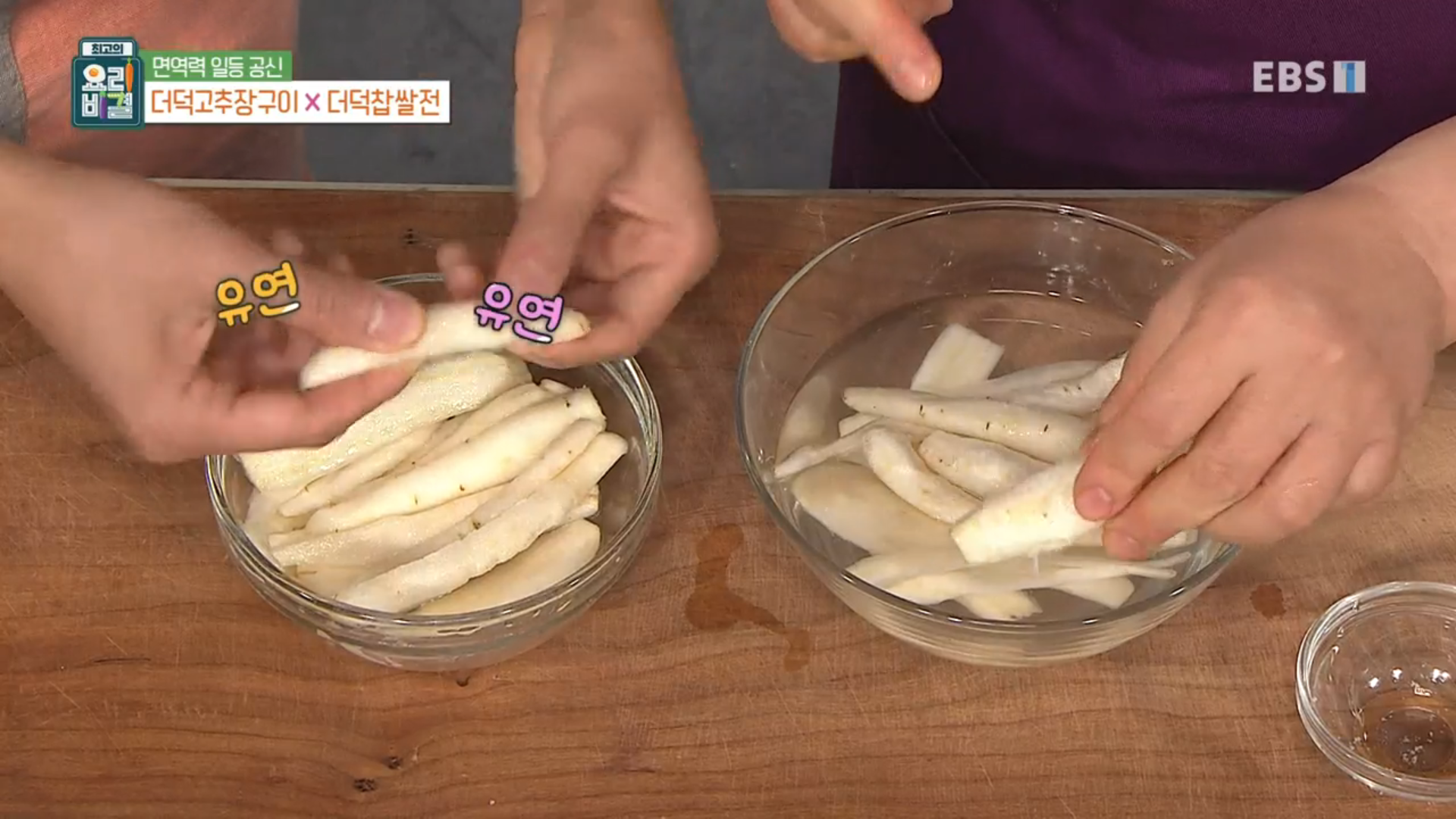 이렇게 더덕을 소금물에 절여주면 더덕이 똑 부러지지 않고 유연해진다고 합니다