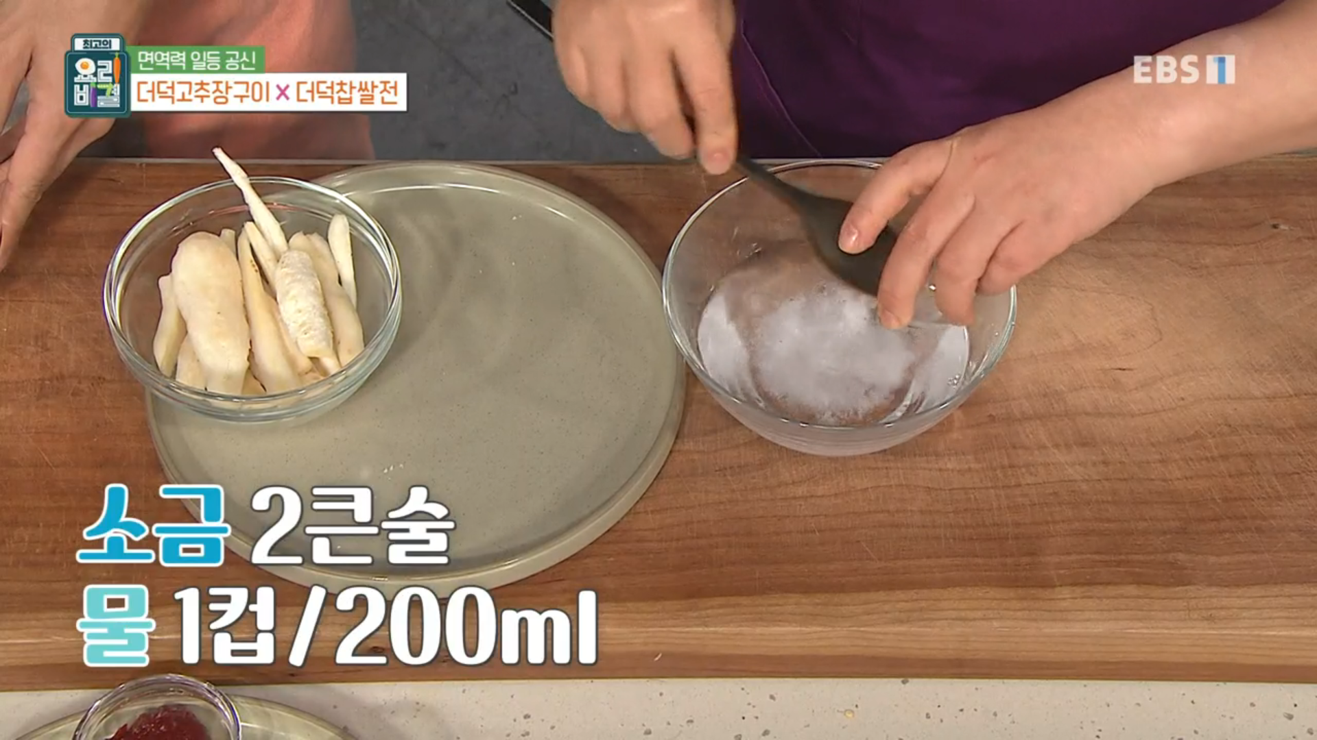 물 1컵에 소금 2큰술을 넣고 소금물을 만들어 더덕 150g을 소금물에 20~30분 정도 절여줍니다