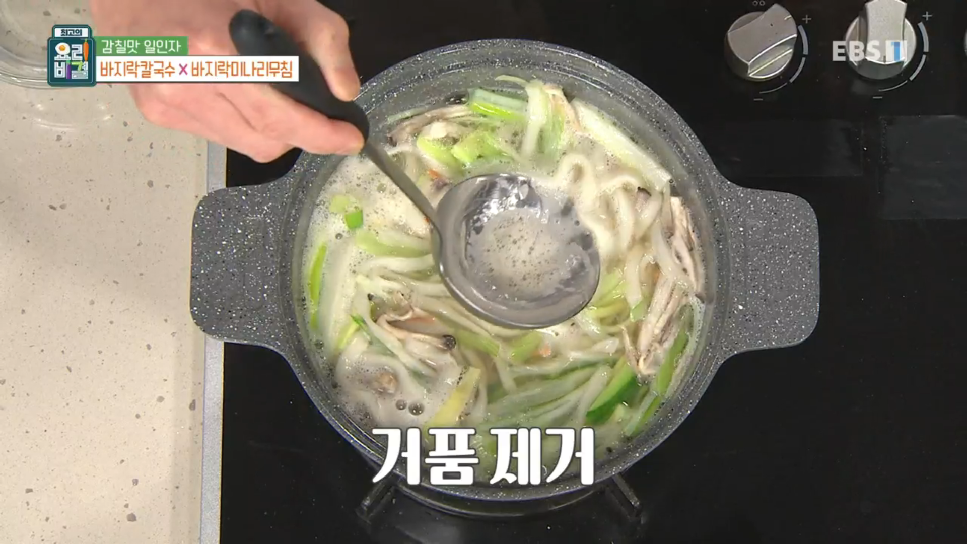 바지락 칼국수를 끓이고 5분 정도 지나면 끓기 시작하는데 떠오르는 거품을 제거해 줍니다
