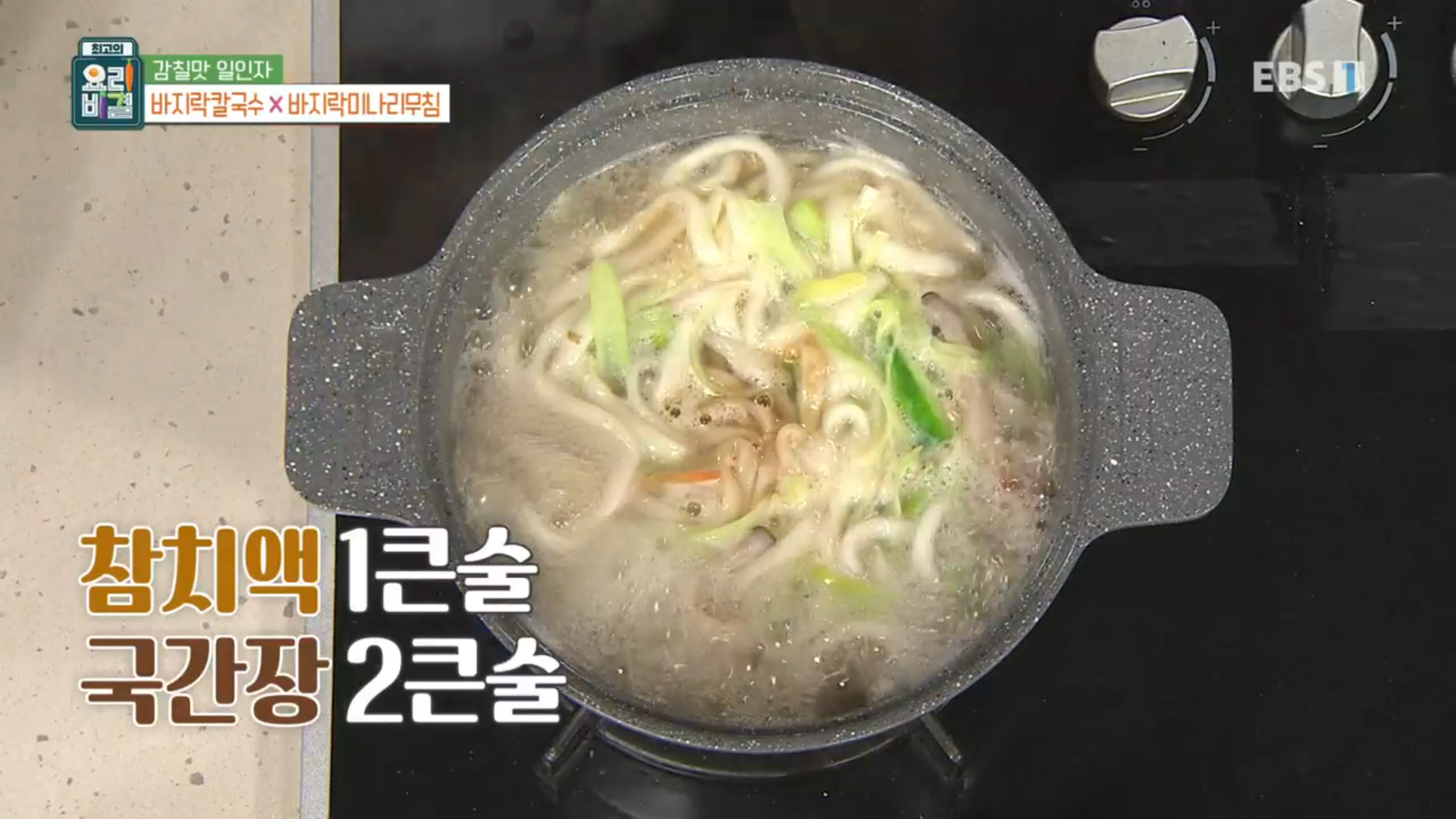 마지막으로 국간장 2큰술과 참치액 1큰술을 넣어 간을 해주면 바지락 칼국수가 완성됩니다