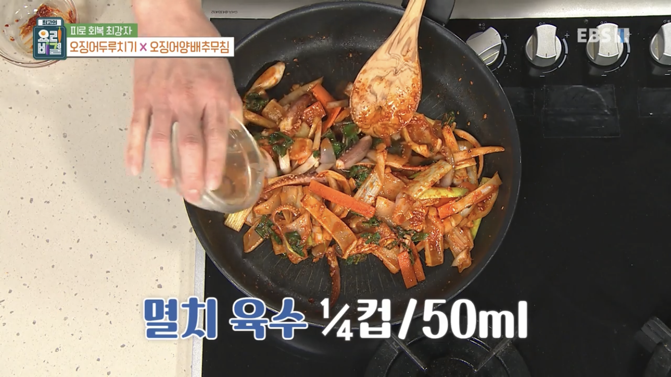 오징어 두루치기에 자작한 국물을 원한다면 멸치육수 1/4컵(50ml)을 넣어주시면 됩니다