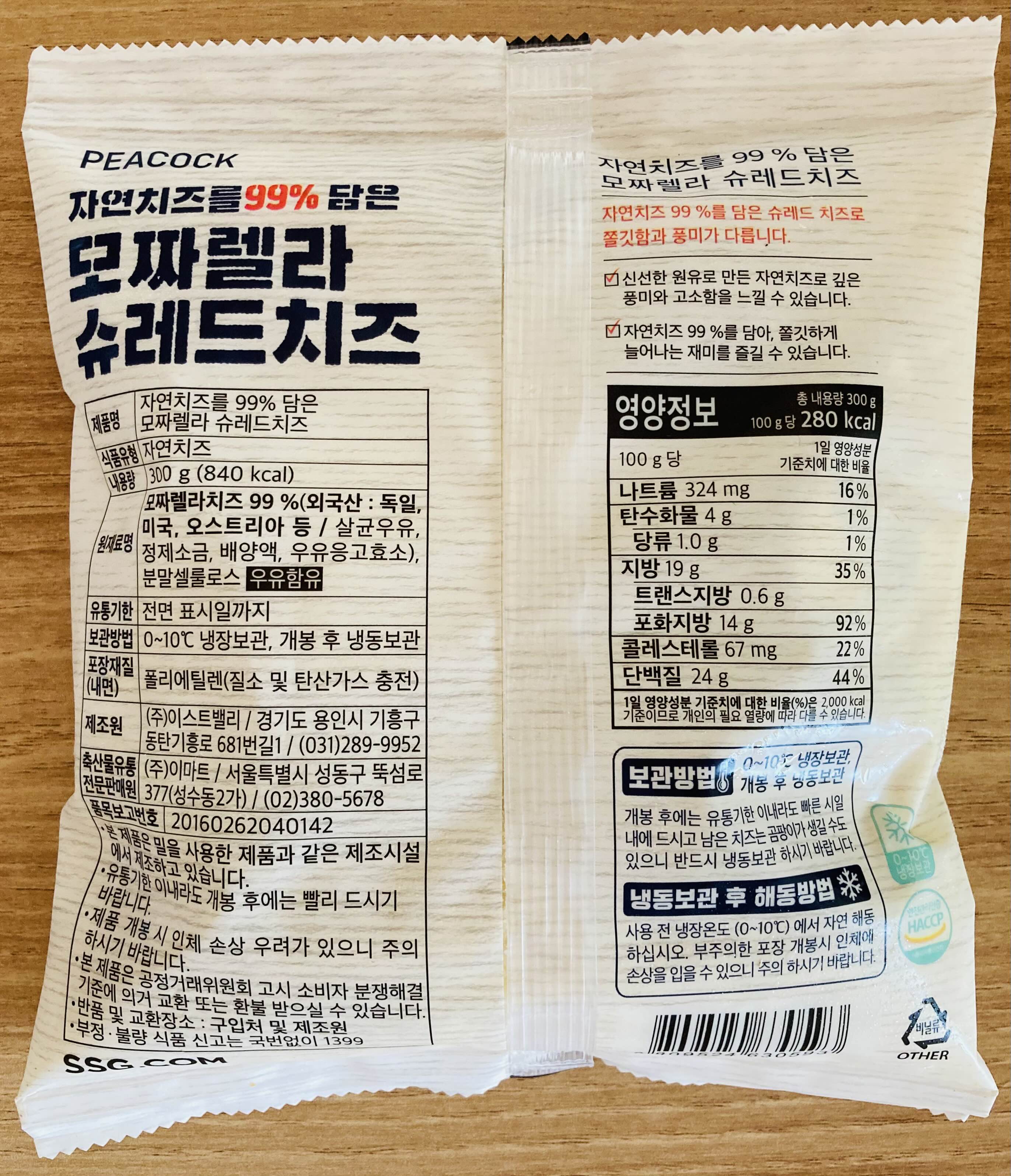 피코크 자연치즈를 99% 담은 모짜렐라 슈레드 치즈 뒷면에 적힌 제품정보입니다