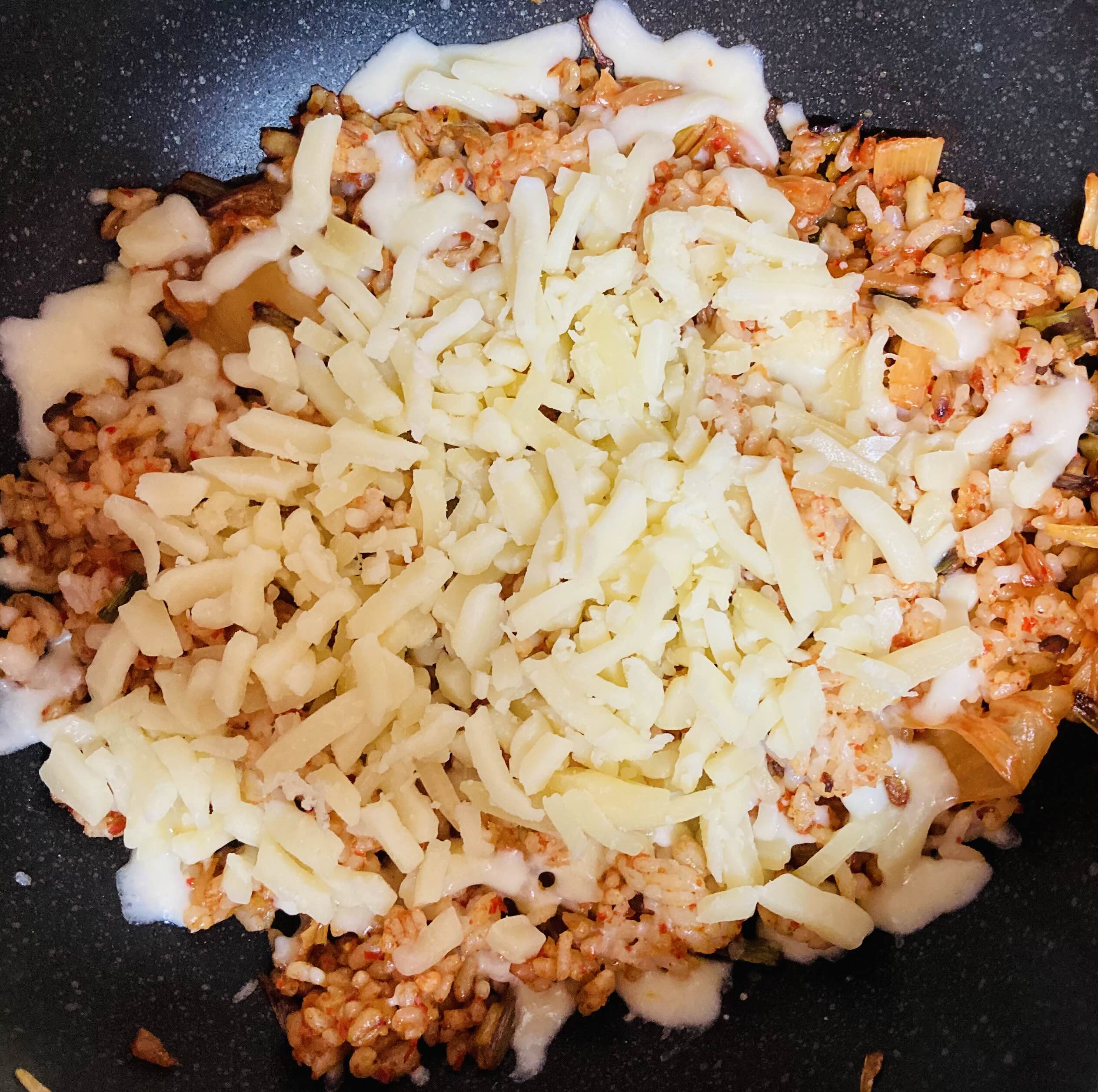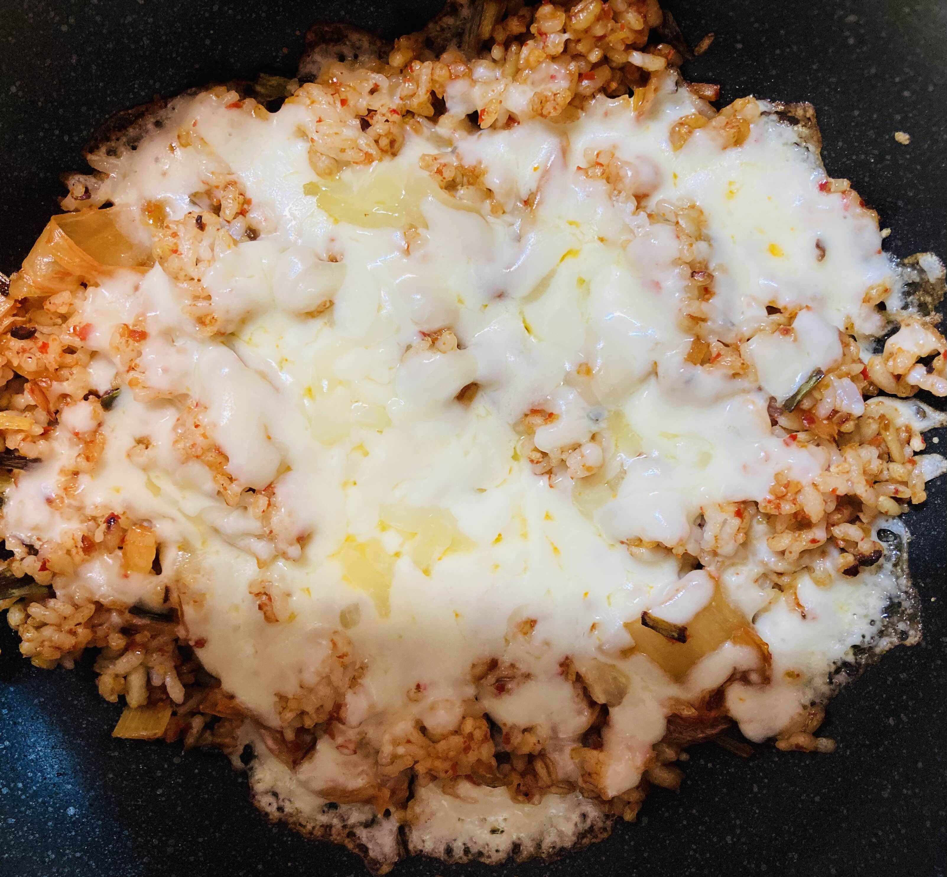 그리고 숟가락으로 김치볶음밥을 들어 올릴 때마다 하얀 치즈가 쭉쭉 늘어나서 먹을 때 시각적으로도 재밌습니다