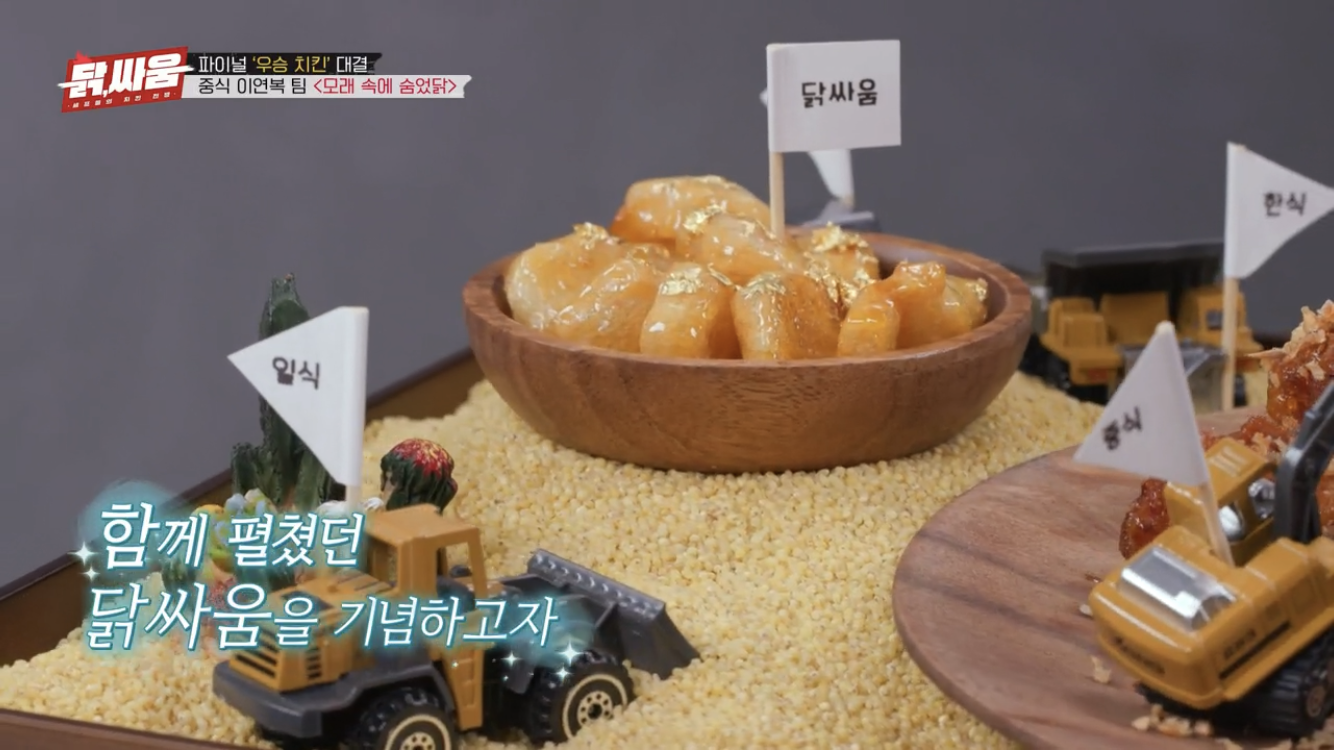 이 플레이팅은 지금은 비록 자리에 없지만 함께 닭싸움을 펼쳤던 한식, 양식, 일식 셰프들의 노력이 값졌다고 생각해 그들을 같이 기념하고 모래 속에서 진짜 치킨을 발굴했다는 의미라고 합니다
