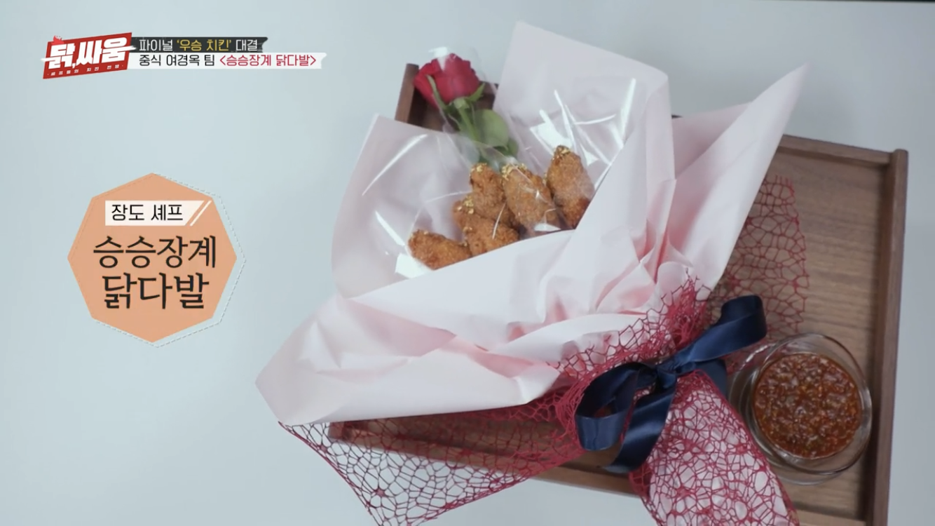 먼저 장도 셰프님의 결승전 치킨요리 승승장계 닭다발부터 심사를 받았습니다
