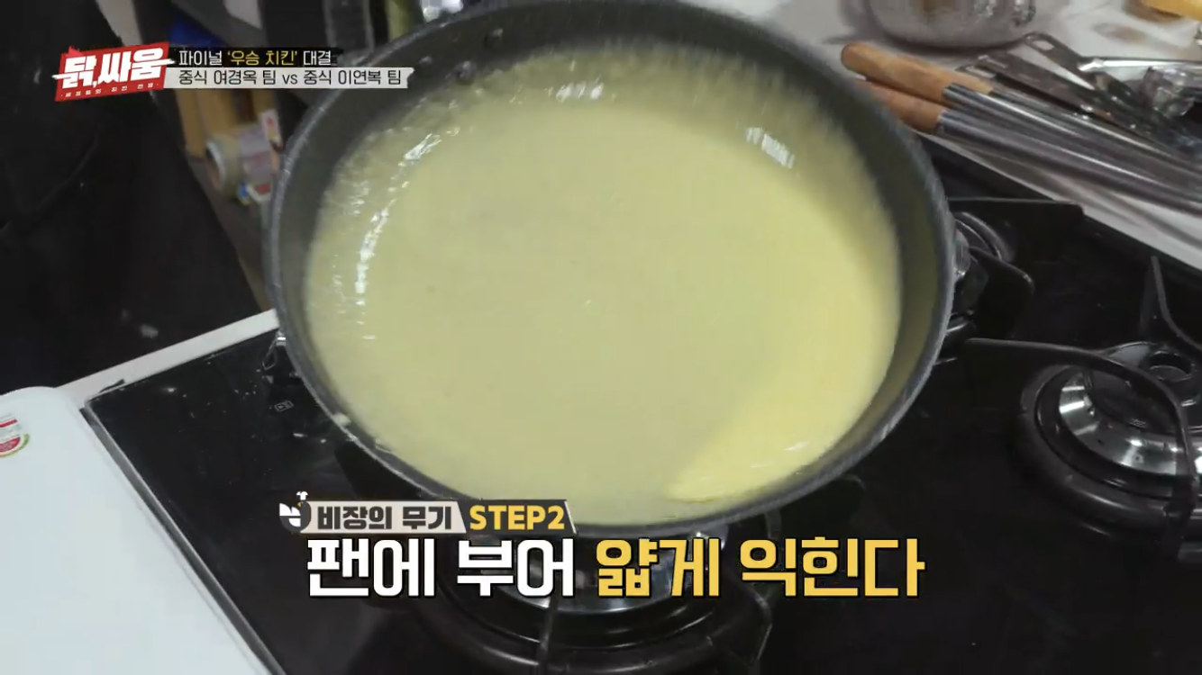 전분이 가열되며 커다랗게 부풀어 오른 달걀지단의 모습을 볼 수 있습니다