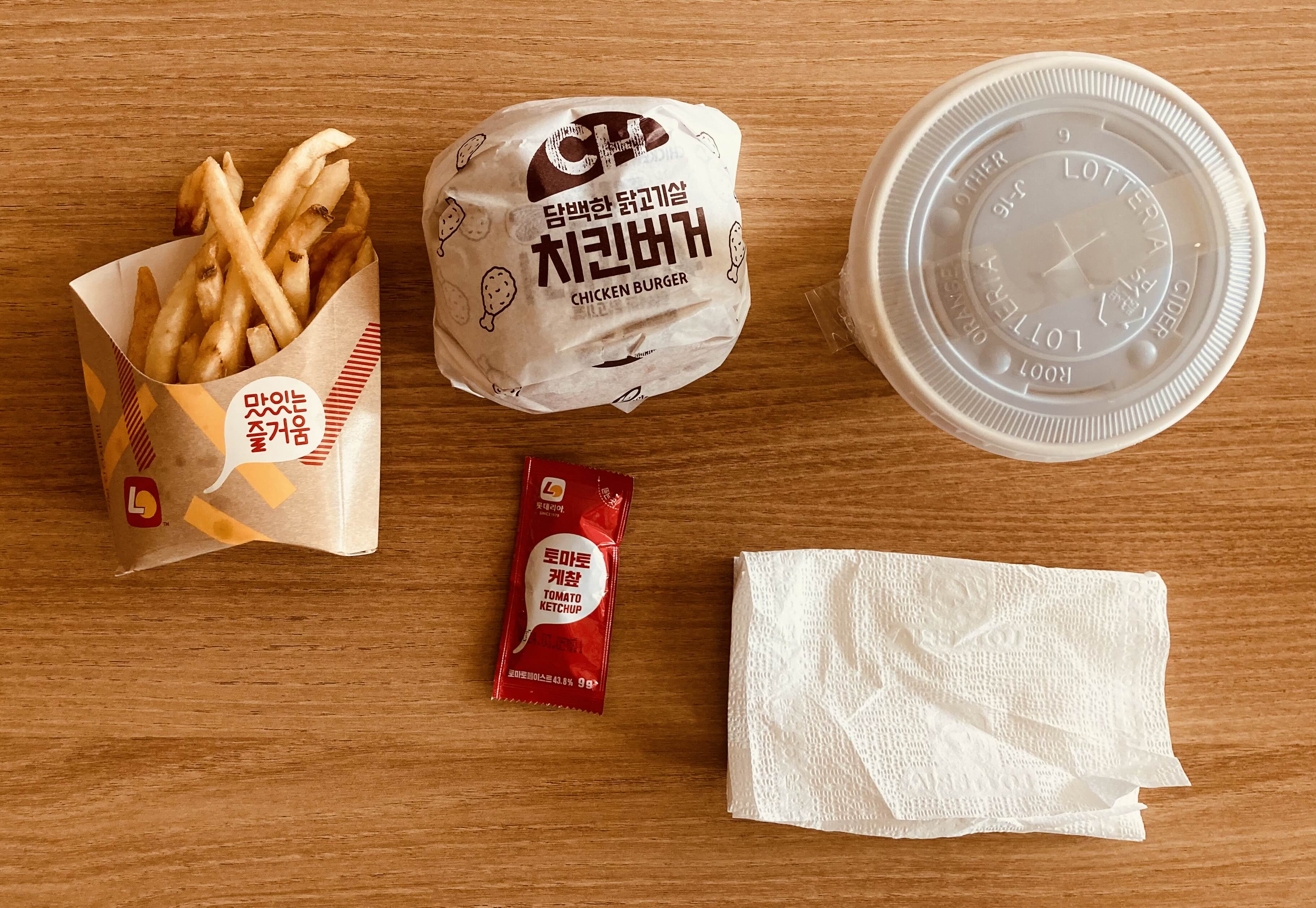 롯데리아 치킨버거의 포장을 개봉했습니다