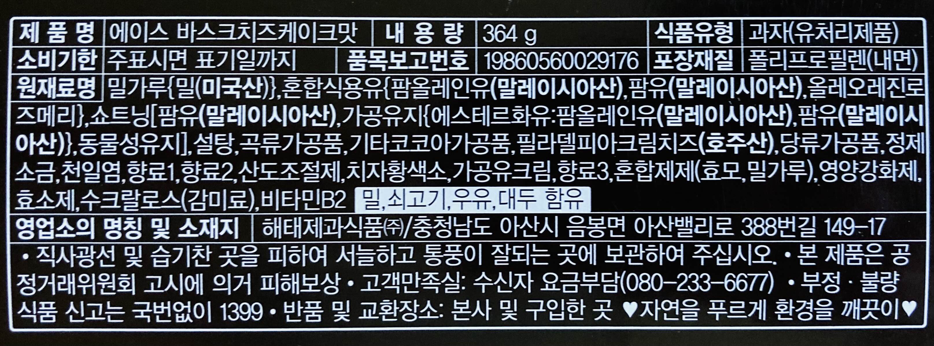 에이스 바스크치즈케이크 맛의 원재료에는 밀가루, 팜유, 설탕, 필라델피아 크림 0.9%, 수크랄로스(감미료), 정제소금, 천일염 등이 들어있습니다