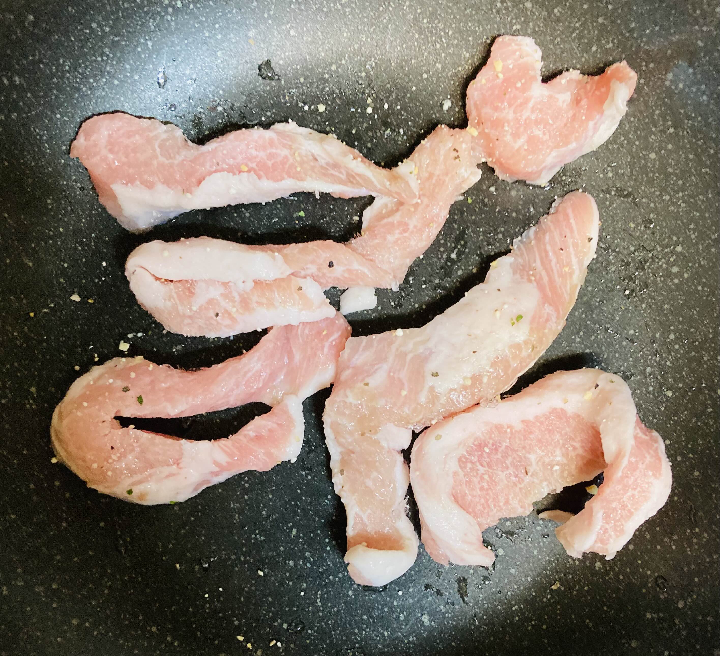 프라이팬에 올린 고기에 맛있으라고 허브솔트를 뿌려줬습니다