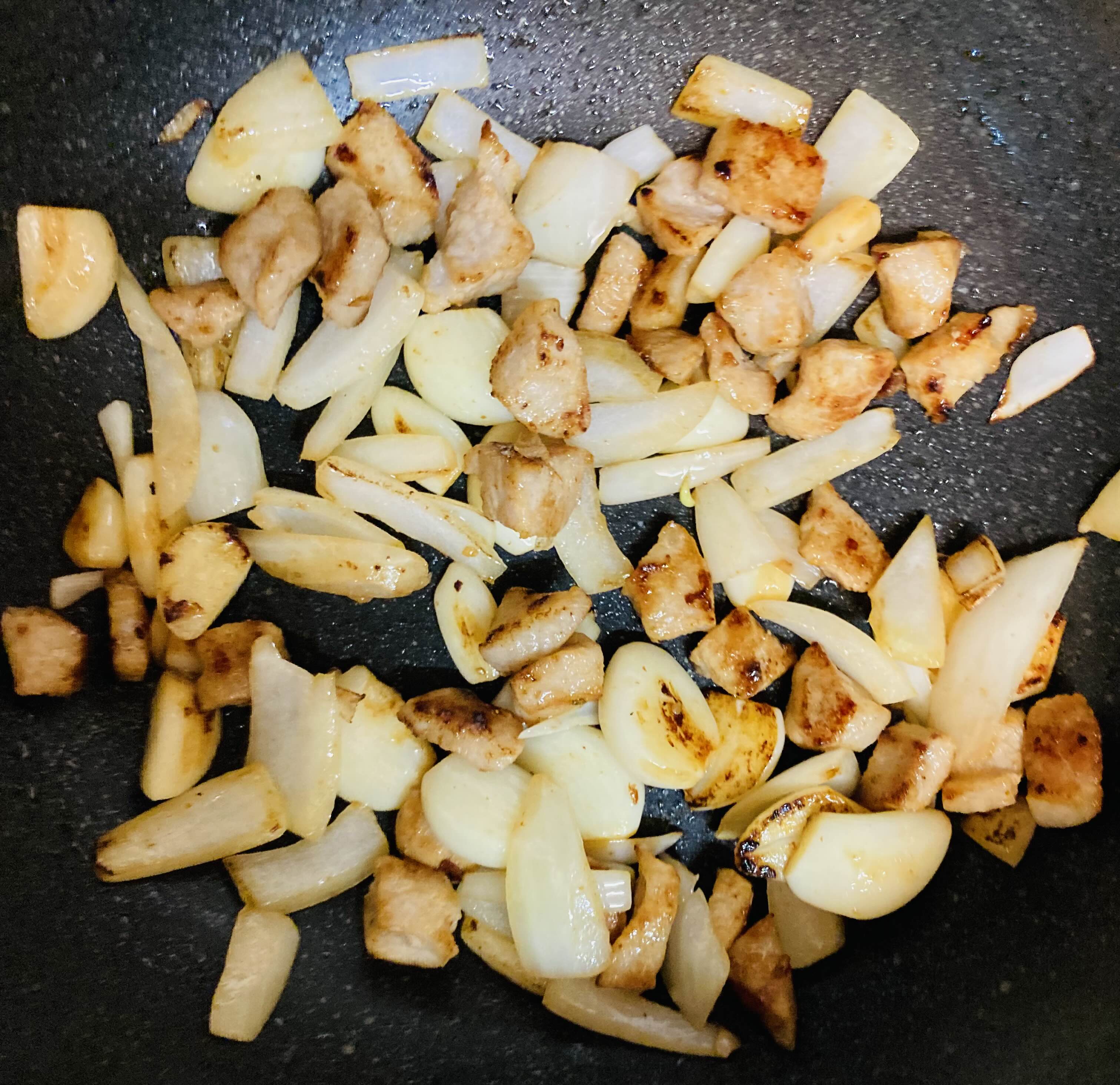 마늘이 노릇노릇하게 익으면 적당한 크기로 썰어준 양파를 넣어주고 볶아줬습니다