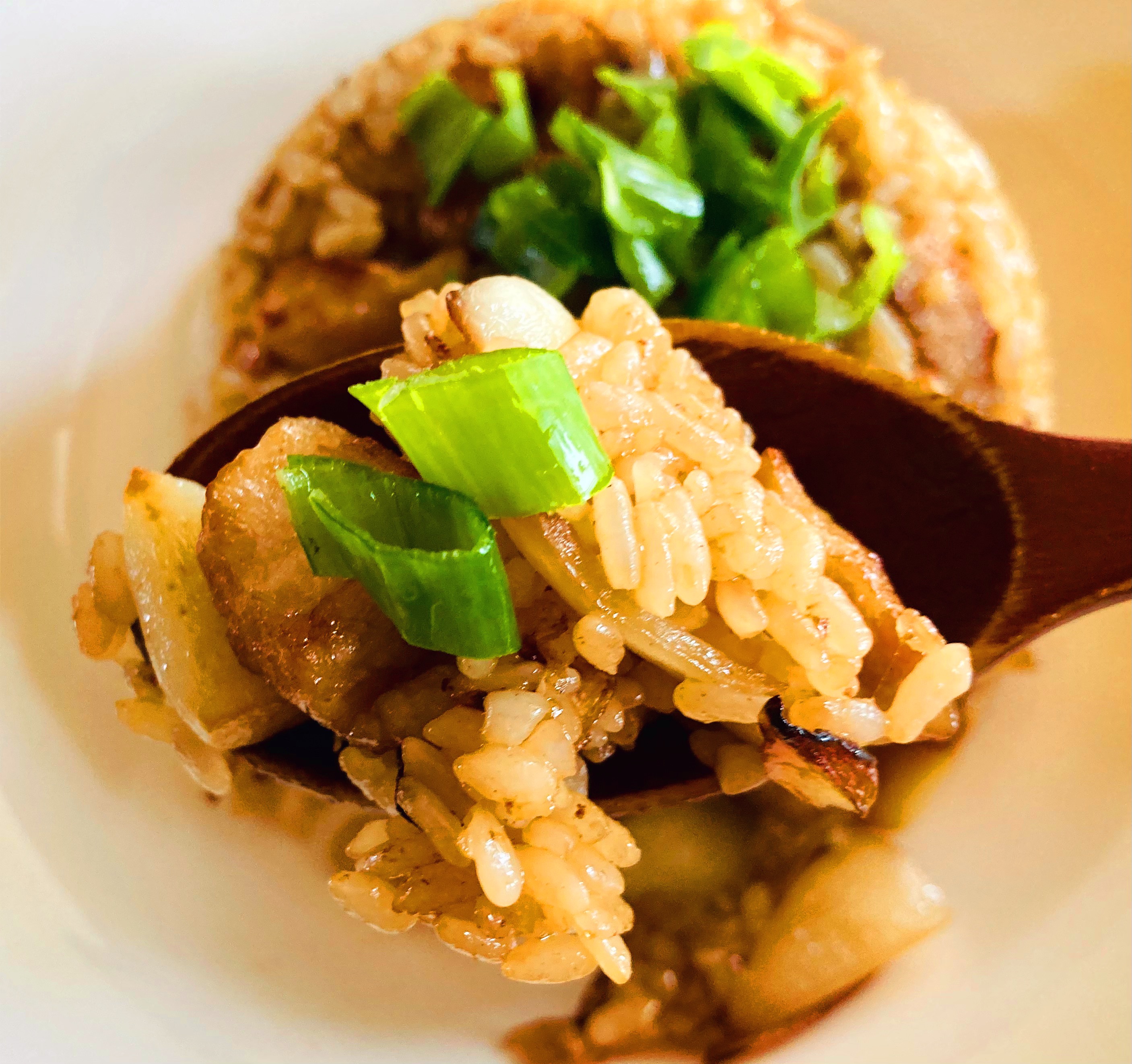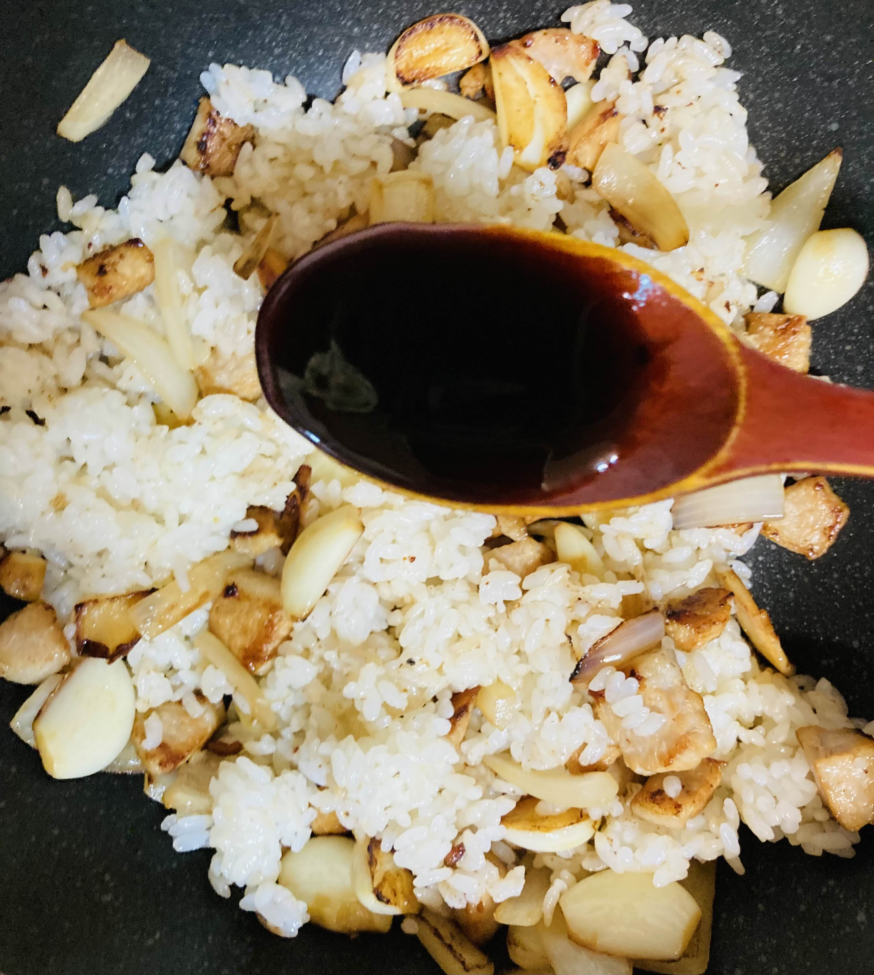 밥알에 골고루 데리야끼 소스색이 입혀졌다면 항정살 데리야끼 볶음밥이 완성됐습니다