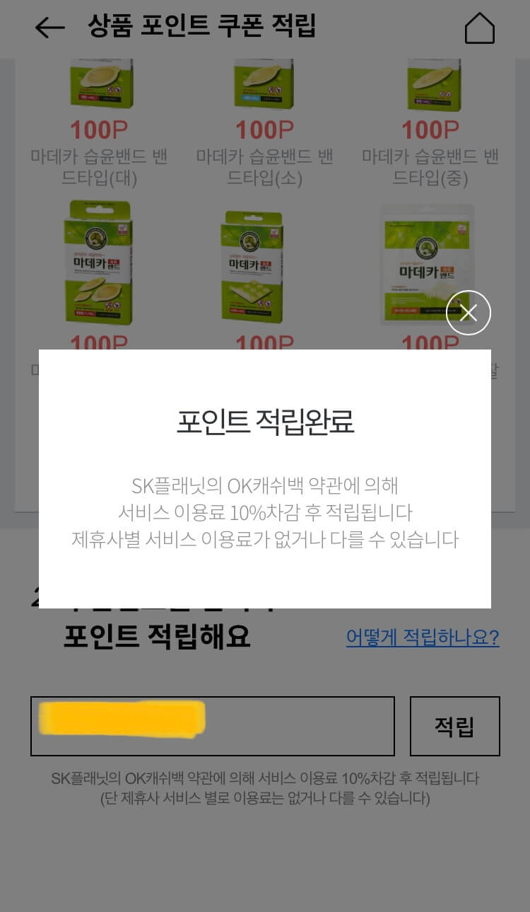OK캐쉬백 포인트 적립을 하고 나면 이렇게 포인트 적립이 완료됐다는 문구가 뜹니다